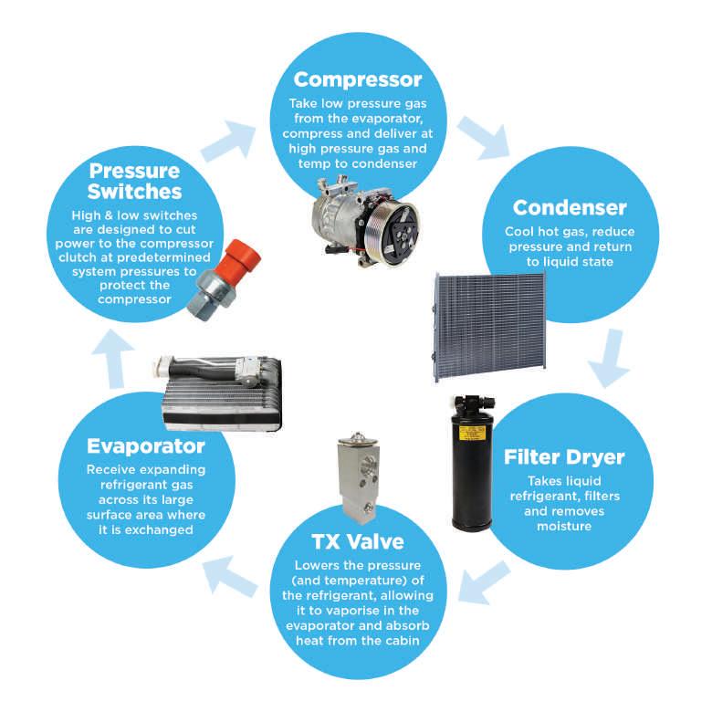 Phil Reynolds works in the product marketing department at PACCAR Parts. Here, he puts his spin on the operation of HVAC.High pressure liquid refrigerant is forced through the TX valve where it expands, dropping in pressure and temperature and evaporates (think of turning on your BBQ gas bottle and as the gas comes out from the high pressure liquid state within the bottle it expands to its gas state cooling as it does). It enters the evaporator core (like your heater core) and blower fans push air across the surface area of the core to exchange that cool refrigerant into cool air for your cab.