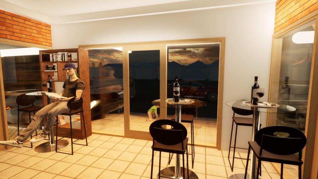 To avoid looking drab and dark, this café has numerous seating areas, each with a different ambiance. On the left side of the building, there is a jungle feeling, while in the right part, there is a photography atmosphere. A bench is provided in the building's back section so that people can relax and enjoy the area of trees that are there.