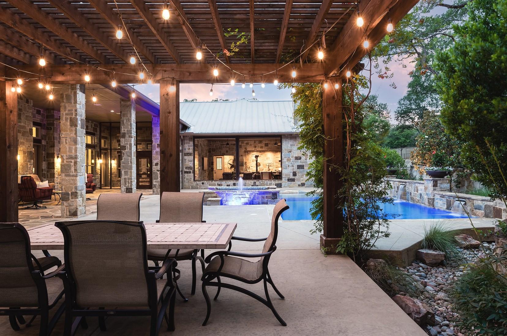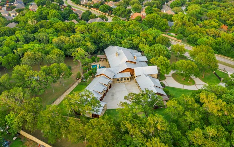 A remarkable find on rare gated 5.446 acres evoking a modern + Hill Country vibe in the center of Flower Mound. Enter through the striking double front doors and into the commanding large foyer within eyesight of all extensive gathering spaces. Wood trellises, tall soaring ceilings and walls of windows and French doors highlight the spectacular living room that is the anchor of the home, viewing the fabulous outdoor venues and lush landscape. This wonderful open concept design was built for entertaining enjoyment year round with luxury amenities throughout. 4 stone fireplaces are found in the dining, kitchen, large living room and the extended covered veranda featuring remote screens + built-in grill/ kitchen + 2 large screen TVs + extensive sound system. The spectacular private 720 sq ft main bedroom features 2 separate baths, each with shower, tub and dual custom closets, along with 3 additional large bed en-suites, one repurposed as a professional theater presently. The high-end custom gourmet kitchen features dual islands, dual drawer dishwashers, digital wolf range and professional hood, Subzero paneled fridge and enjoys the best views of the entire back yard haven. The handsome wood beamed large library has access to it’s own veranda, plus an additional second study with 25’ built-in cabinets. The home also features a wine room, elevator, 7 car epoxy garages with an adjacent 18 x 13’ AC'd workshop and bath. There is an additional 1,438 ft AC’d finished loft + fully equipped 700 sq ft detached 3 room guest house, showcasing a living room, kitchen bar, separate bedroom + bath and private outdoor covered veranda. The extensive outdoor living areas include the soaring stone covered veranda, screened living center, an al fresco dining area, custom walk-in pool, separate spa featuring LED lighting system and tranquil water features with plenty of green space ready for horses, livestock and barn. The landscaped grounds encompass so much beauty enhanced by the newly installed tree lights, up lights, rock edging, extensive added landscape, café lighting and premium sound system throughout the home. An entire home water filtration system and property water well rounds out this spectacular executive living experience in the heart of the coveted exemplary Flower Mound schools, close to DFW airport, shopping and restaurants.