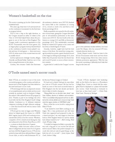 Women’s basketball on the rise The arrow is pointing up for the Clark women’s basketball team. Two years ago, they were 5-20 and missed out on the conference tournament for the first time in program history. 2010-11 was a step in the right direction, as the Cougars enjoyed an influx of talent in the Class of 2014 that helped them return the program to one of the best in New England. The Cougars made a postseason appearance in the ECAC Tournament, won the most games (12) in league play in program history, finished third in the conference, hosted a home playoff contest and won 16 total games — their most since 2005-06, when most of the current team was still in middle school. Led by sophomores Ashleigh Condon, Megan Grondin and Emily Reilly, Clark has one of the best scoring threesomes in the nation. Condon, who became Clark’s first first-team