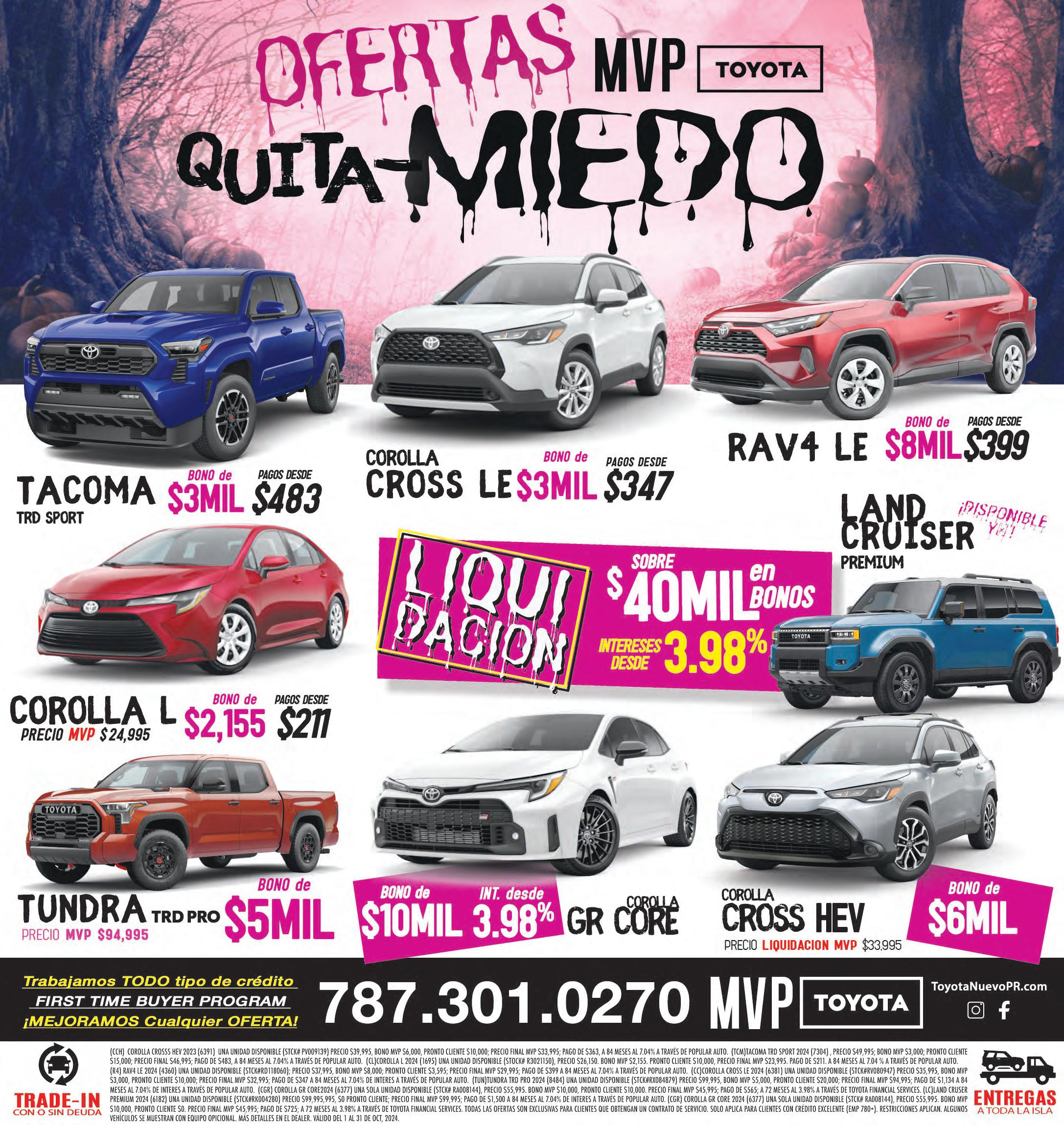 Corolla. 4. Cero pagos por tres meses aplica a autos Toyota: 2024 Corolla Sedan, 2024 Corolla Cross, 2024 Corolla HB y 2024 RAV4. En autos Nissan cero pagos por tres meses aplica a clientes elegibles del Tier 1+, y 2023 Kicks. Sujeto a aprobación de crédito. 5. 2024 Rogue S (RO-2404). Stock #002588. Precio de Venta $33,995. Pronto de $16,000. Pago mensual de $259 al 5.25% APR a un término de 84 meses. Financiado 6.84% APR a un término de 84 meses. Financiado a través de Oriental Bank. Empírica de 800+. Sujeto a aprobación de crédito. 7. 2024 Versa - Stock #816196 (VES-2403). Precio de liquidación $18,995. 8. 2025 KICKS