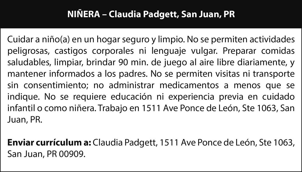 Send resumes to: Claudia Padgett, 1511 Ave Ponce de Leon, Ste 1063, San Juan, PR 00909.