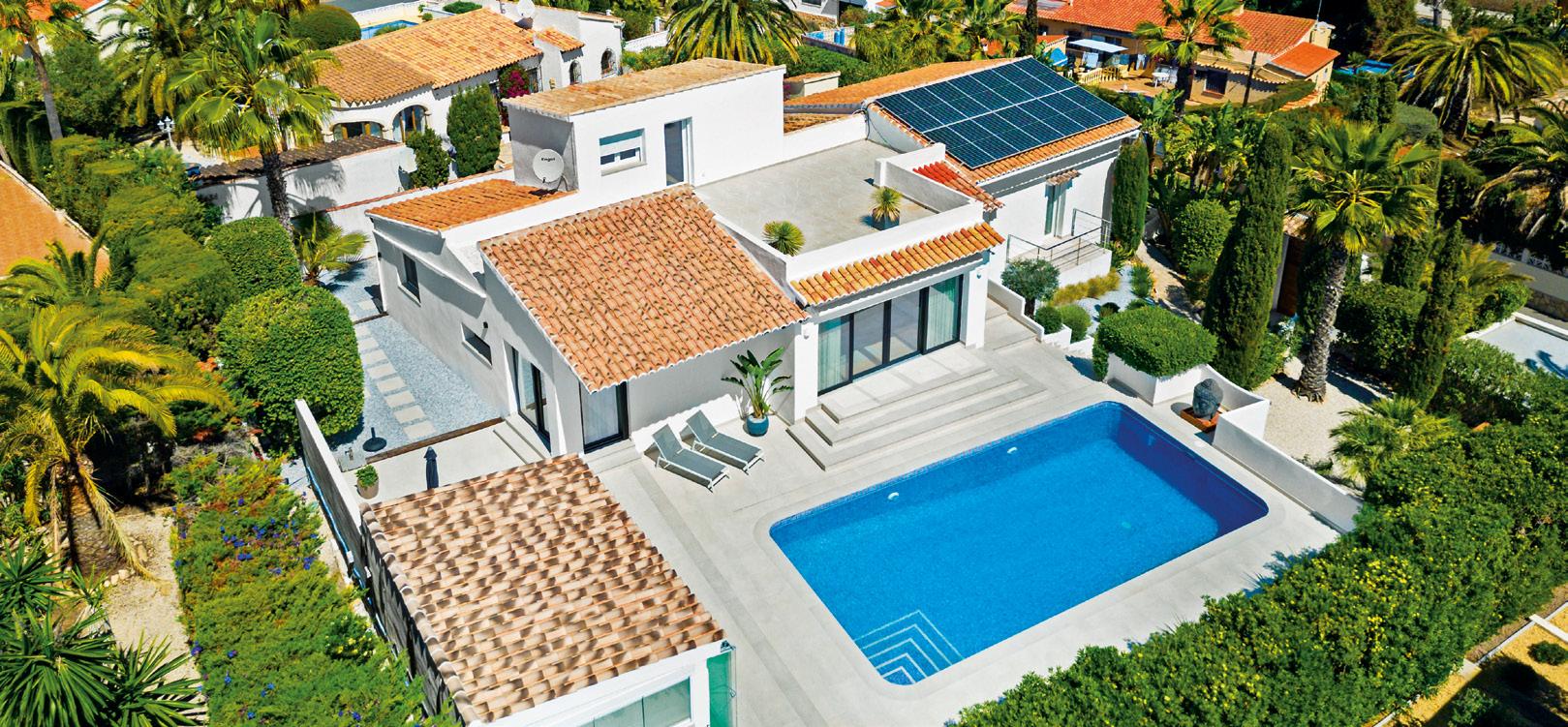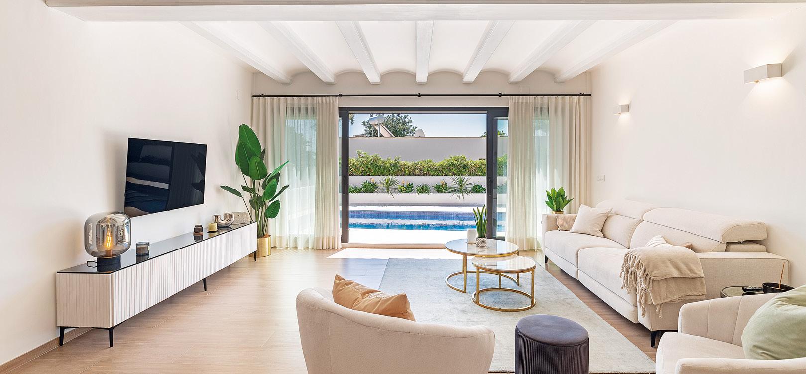 Moderna villa de estilo mediterráneo completamente reformada y con mucha privacidad. Cuenta con un amplio espacio exterior con piscina de agua salada y zona de barbacoa, garaje privado, calefacción por suelo radiante, aire acondicionado y paneles solares.