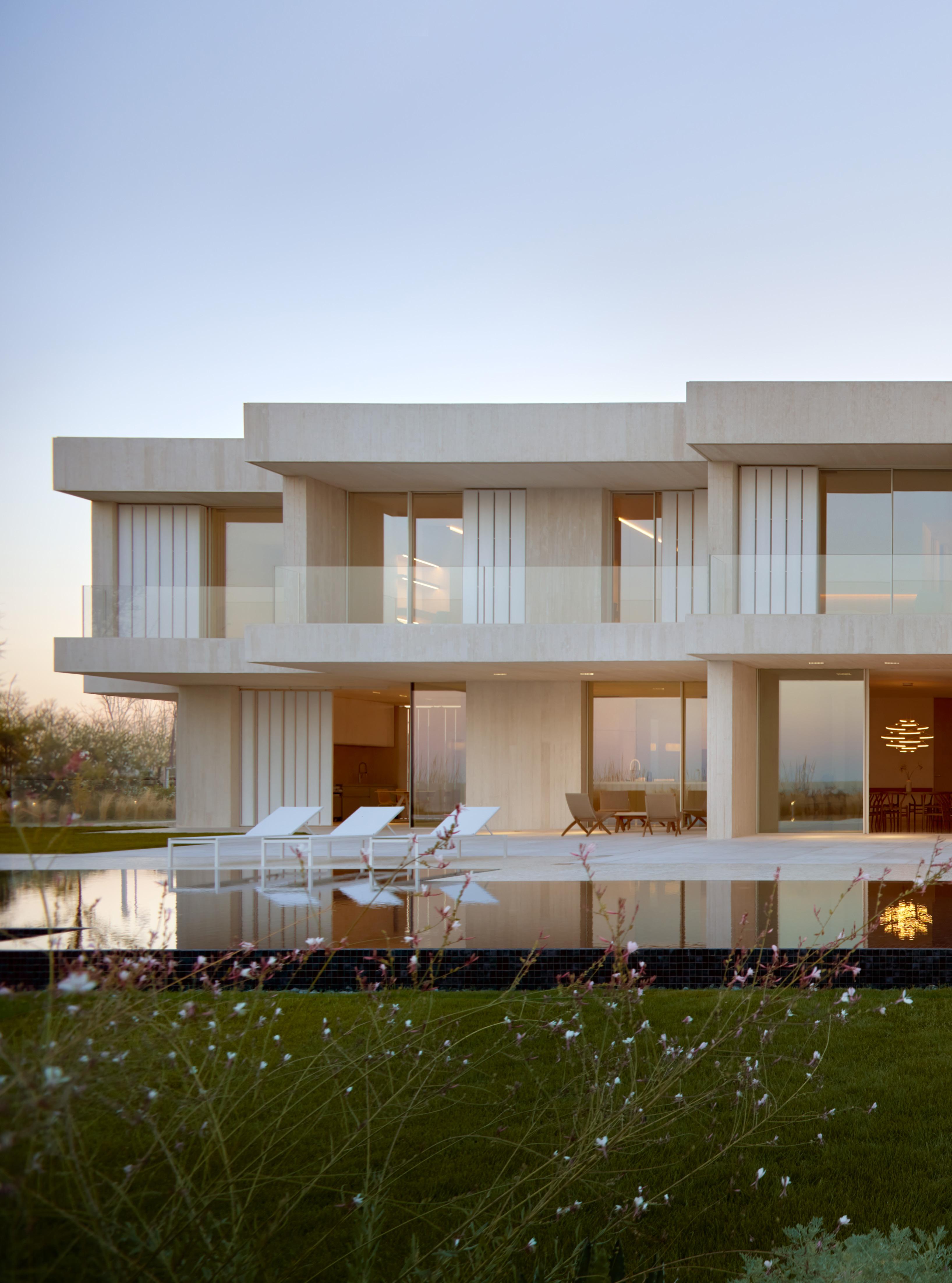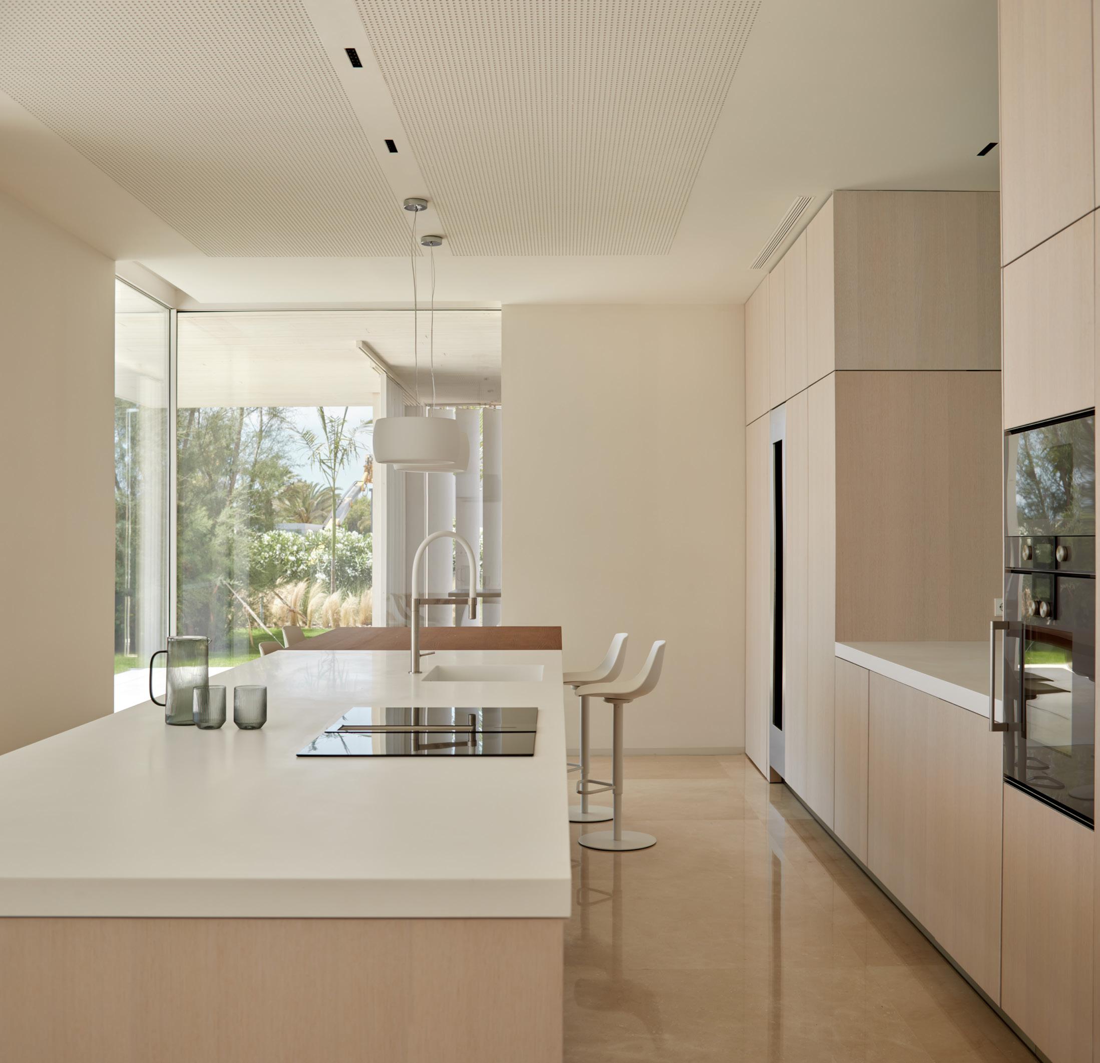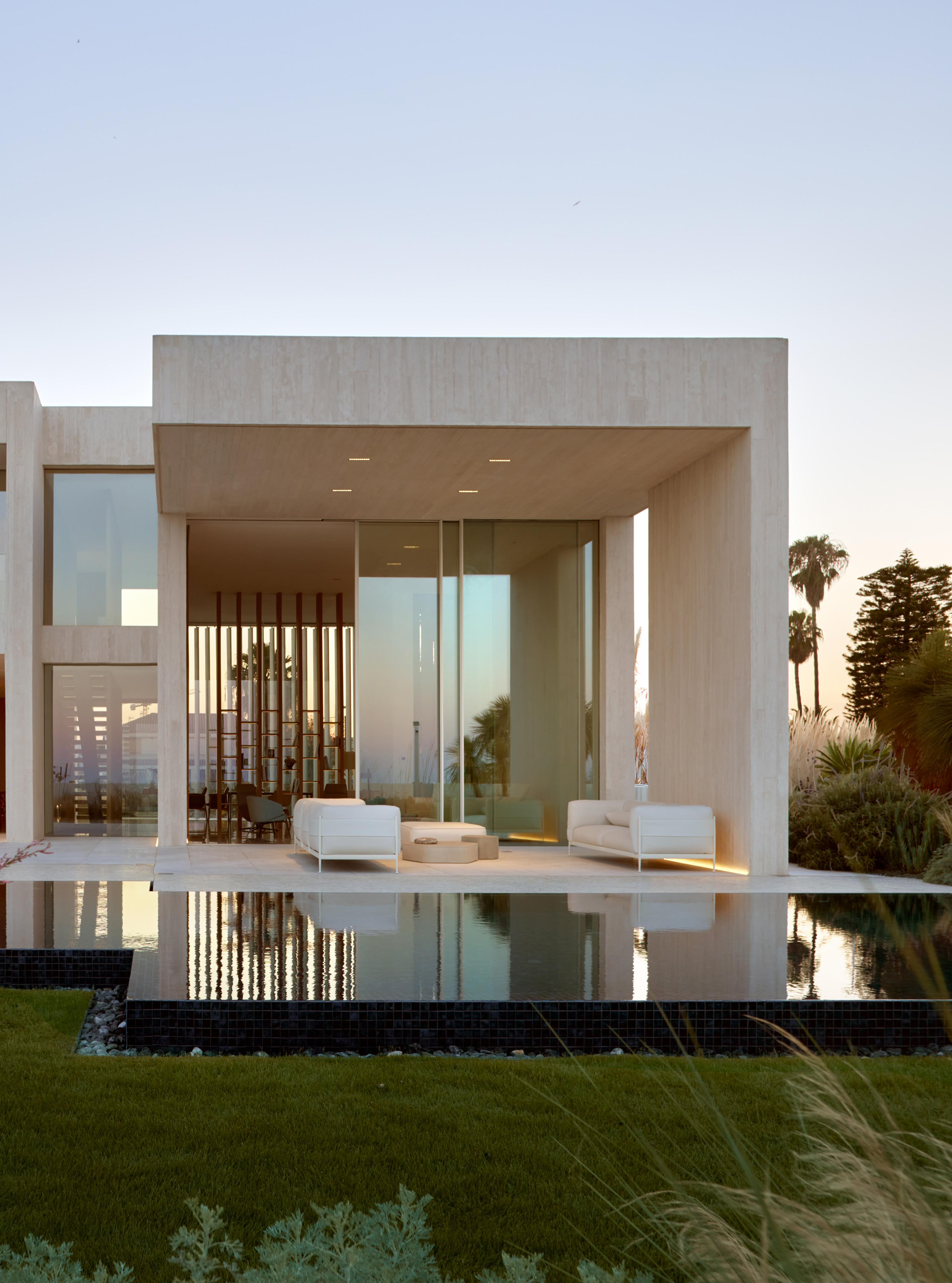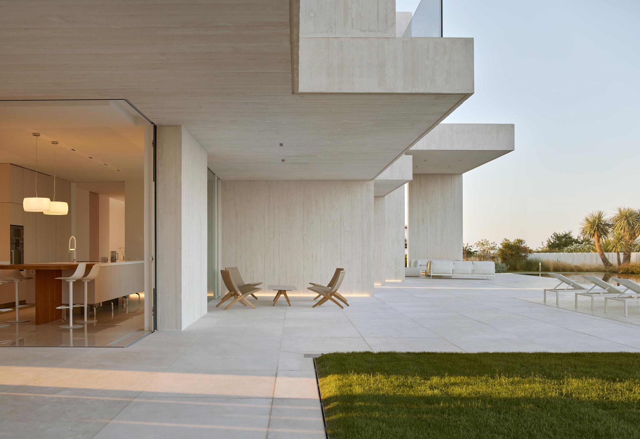 La casa está formada por una envolvente de hormigón blanco que genera una gran cáscara de protección para un interior armónico y delicado, donde predominan las maderas claras y la piedra natural. Los grandes voladizos y el sistema de lamas protegen a la vivienda del salitre, el soleamiento y las vistas desde la playa.