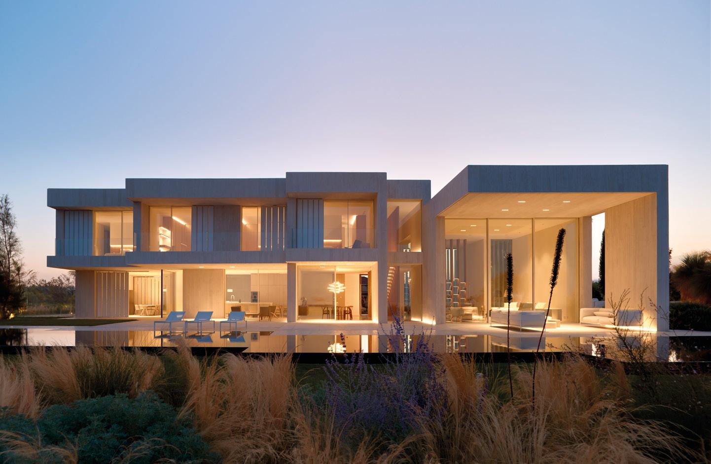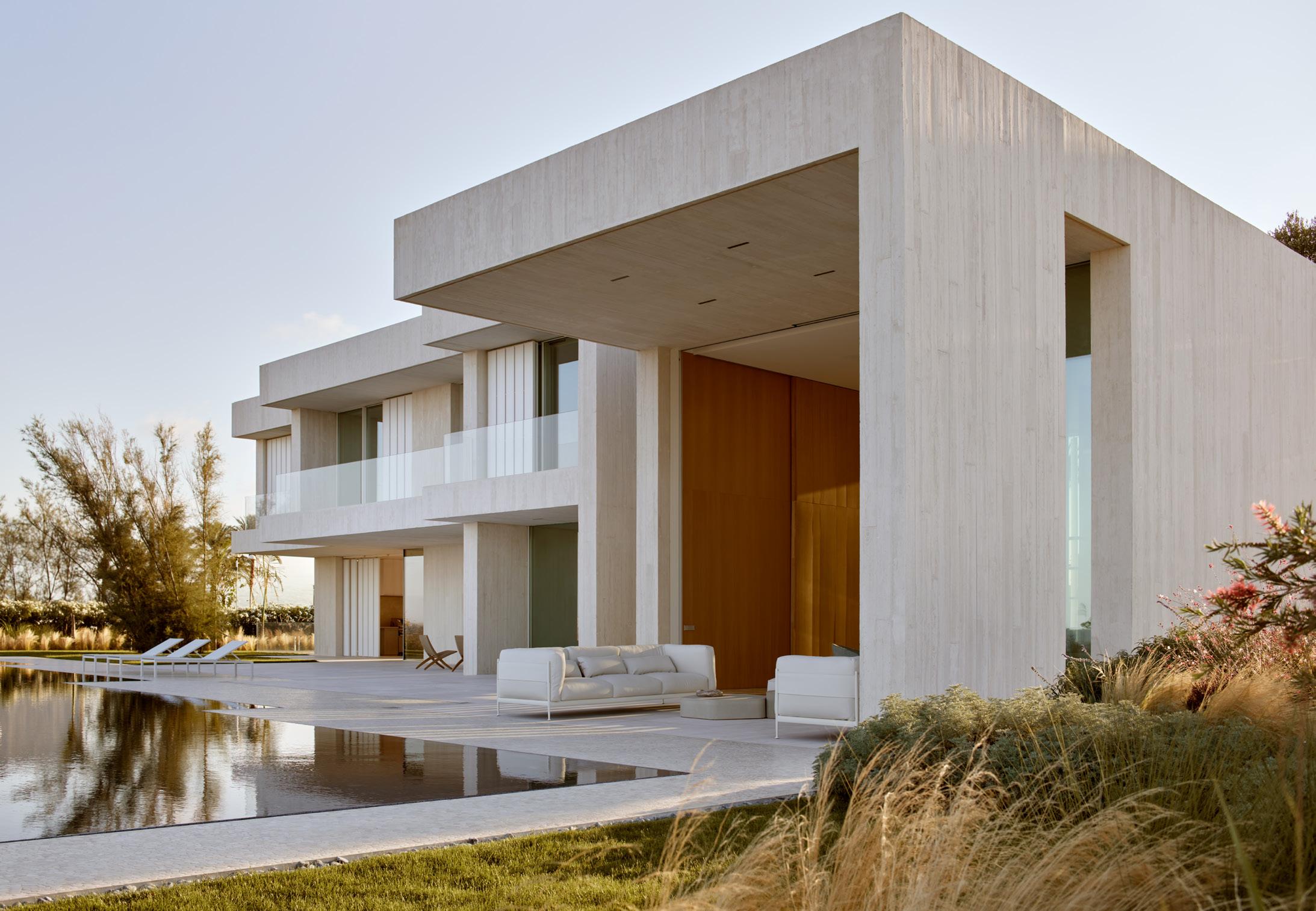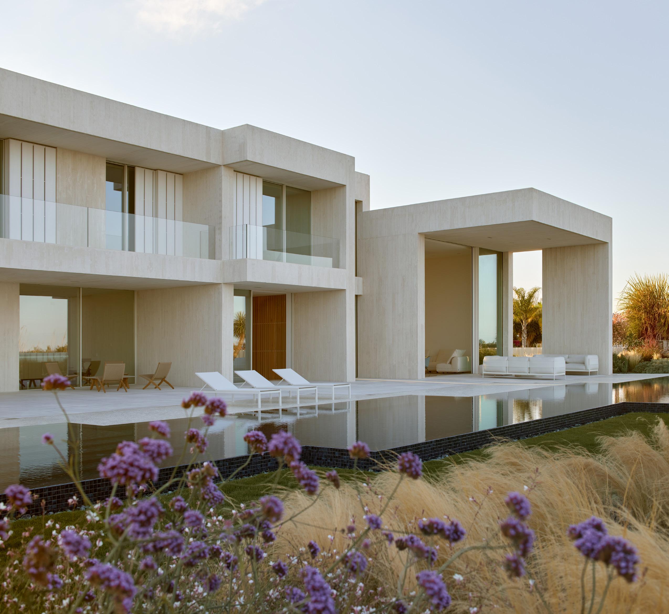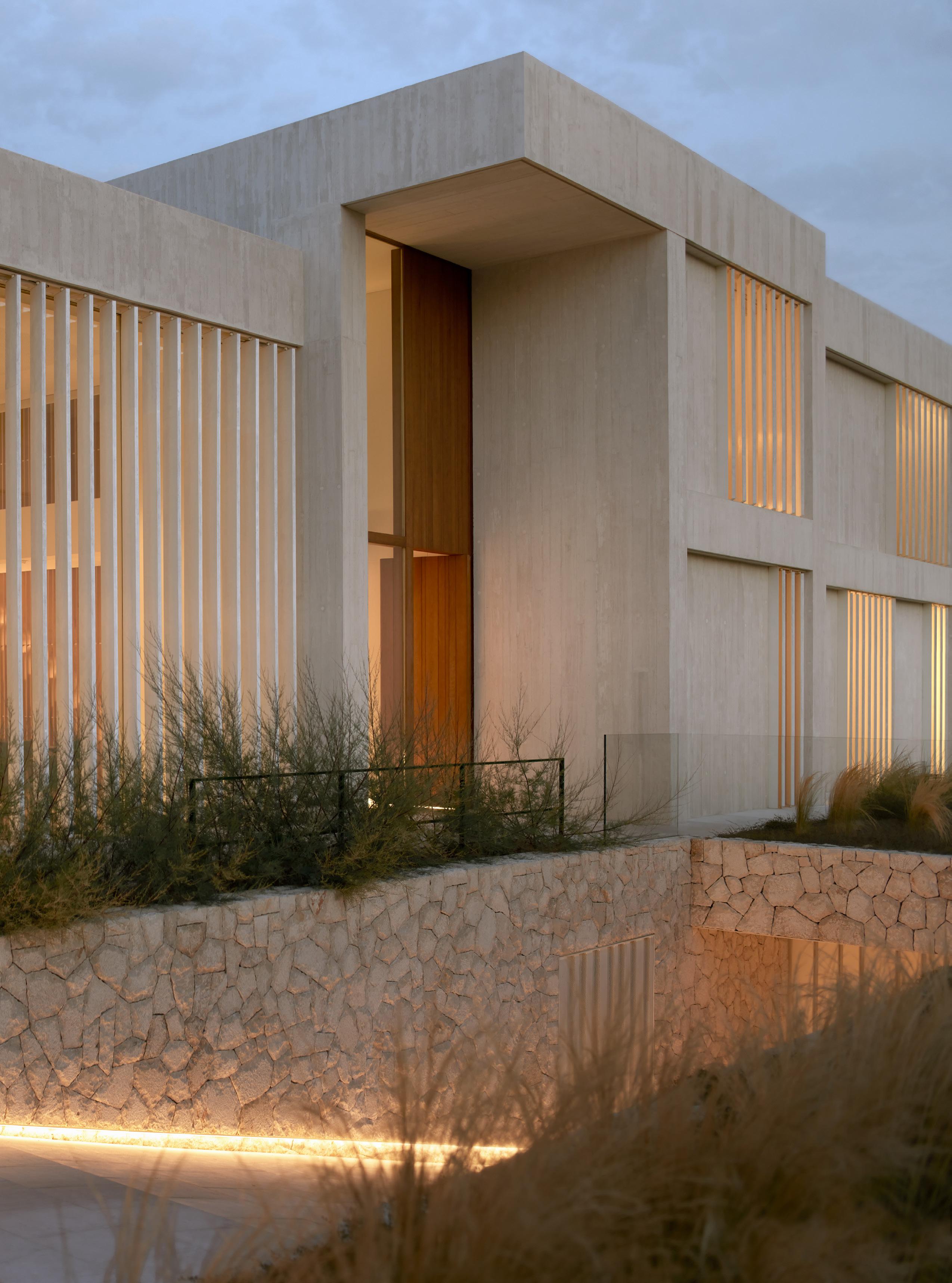The house is made up of a white concrete envelope that generates a large protective shell for a harmonious and delicate interior, where light woods and natural stone predominate. The large overhangs and the system of slats protect the house from saltpeter, sunlight and views from the beach.