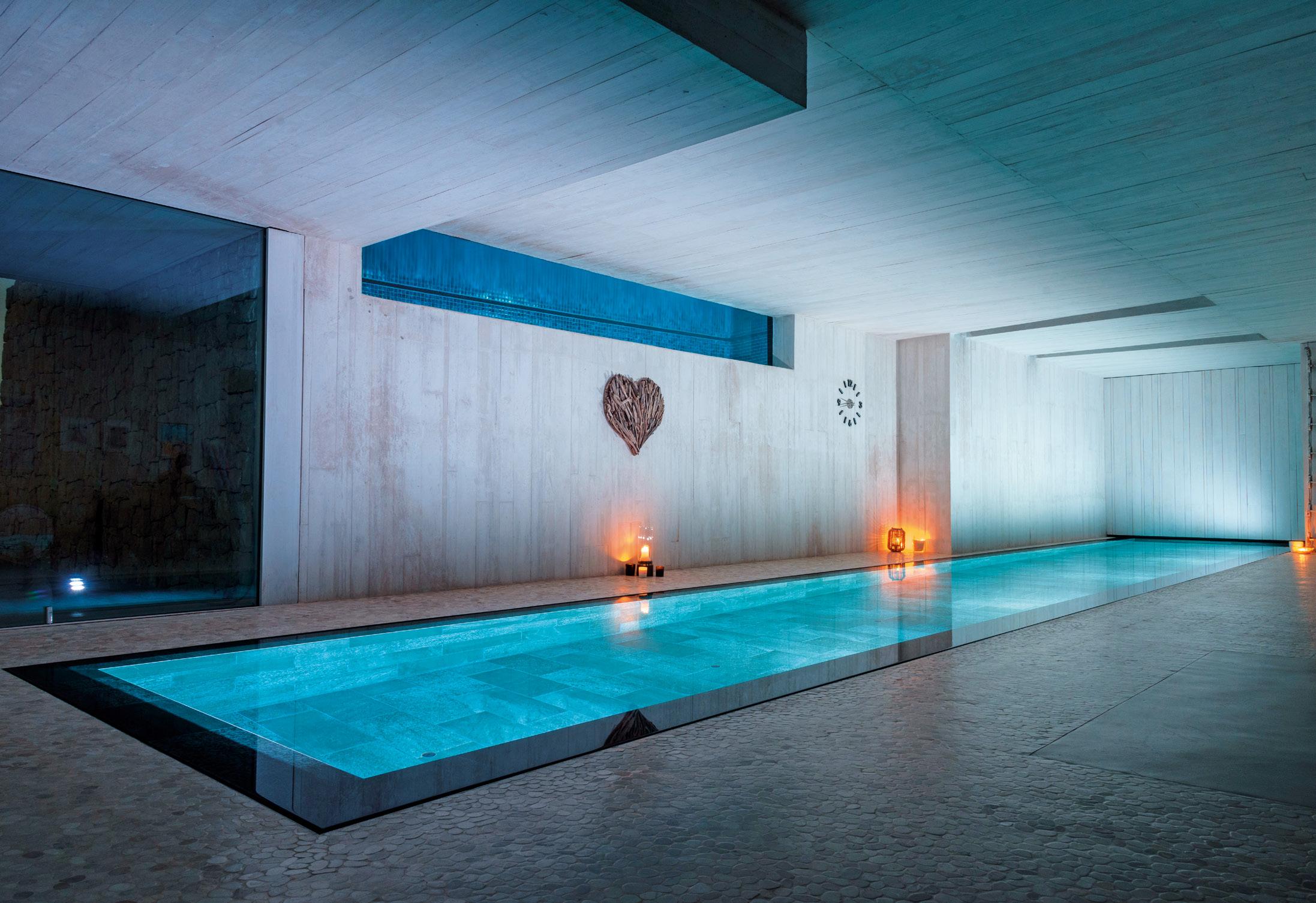 La planta baja concentra las estancias de día y se genera una distribución fluida con conexiones visuales entre las diferentes estancias. El programa se replica en el exterior, protegido por los grandes voladizos. Las terrazas quedan rematadas por una gran piscina ubicada en el borde de la parcela.