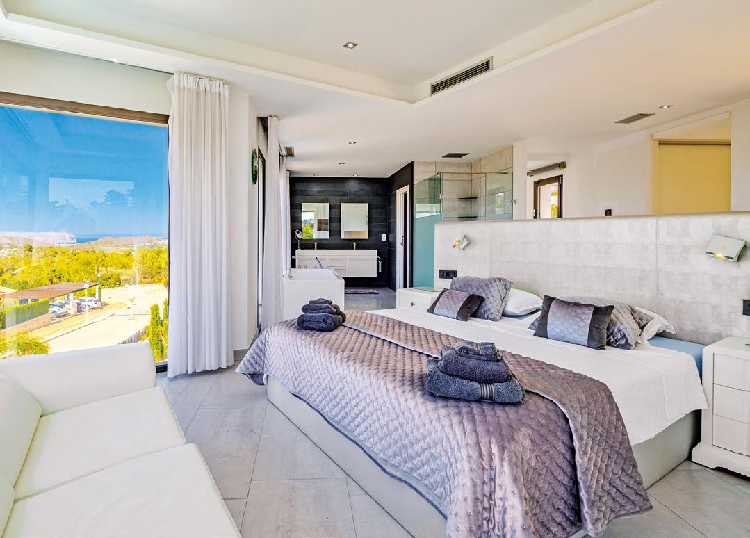 Planta alta con 3 dormitorios y 2 baños ( 1 en-suite). Amplias terrazas con jardín orientada al sur, donde disfrutar de las impresionantes vistas al mar desde varios rincones de la casa como desde varios dormitorios.