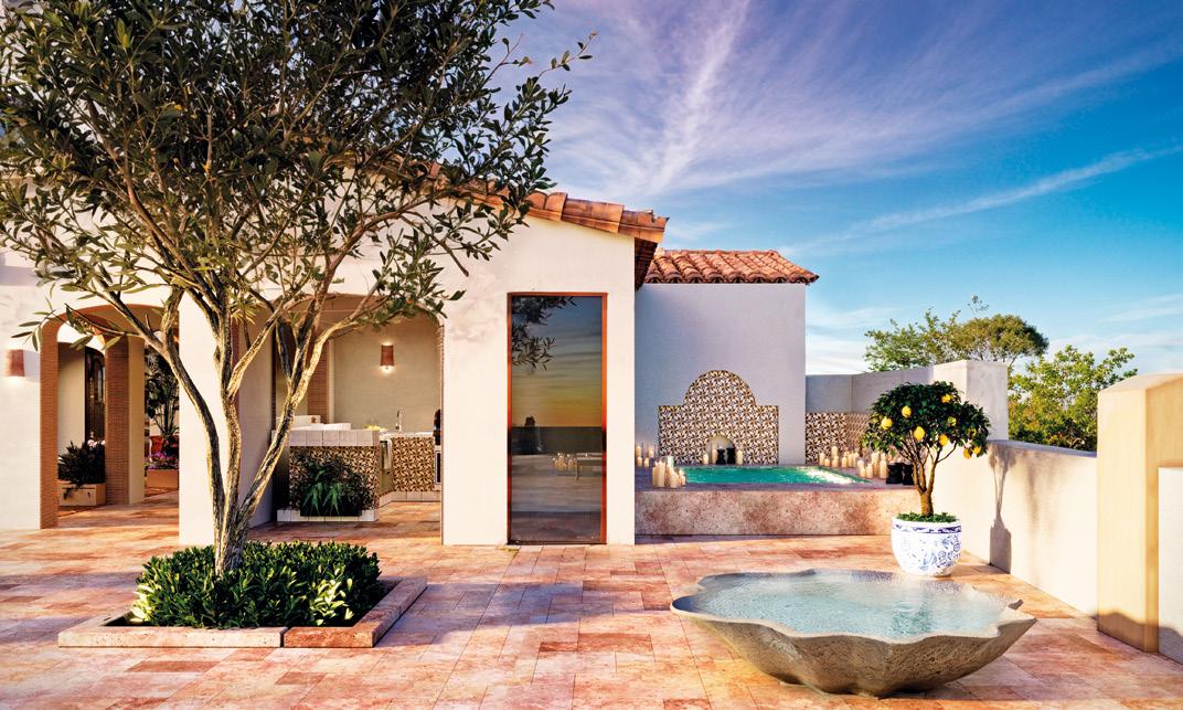 Tosca stone pillars dress the opening into the sitting room where raw wood beams give the space a touch of natural warmth. You can also open up the sitting room to the naya and pool terrace, in effect bringing outside in.