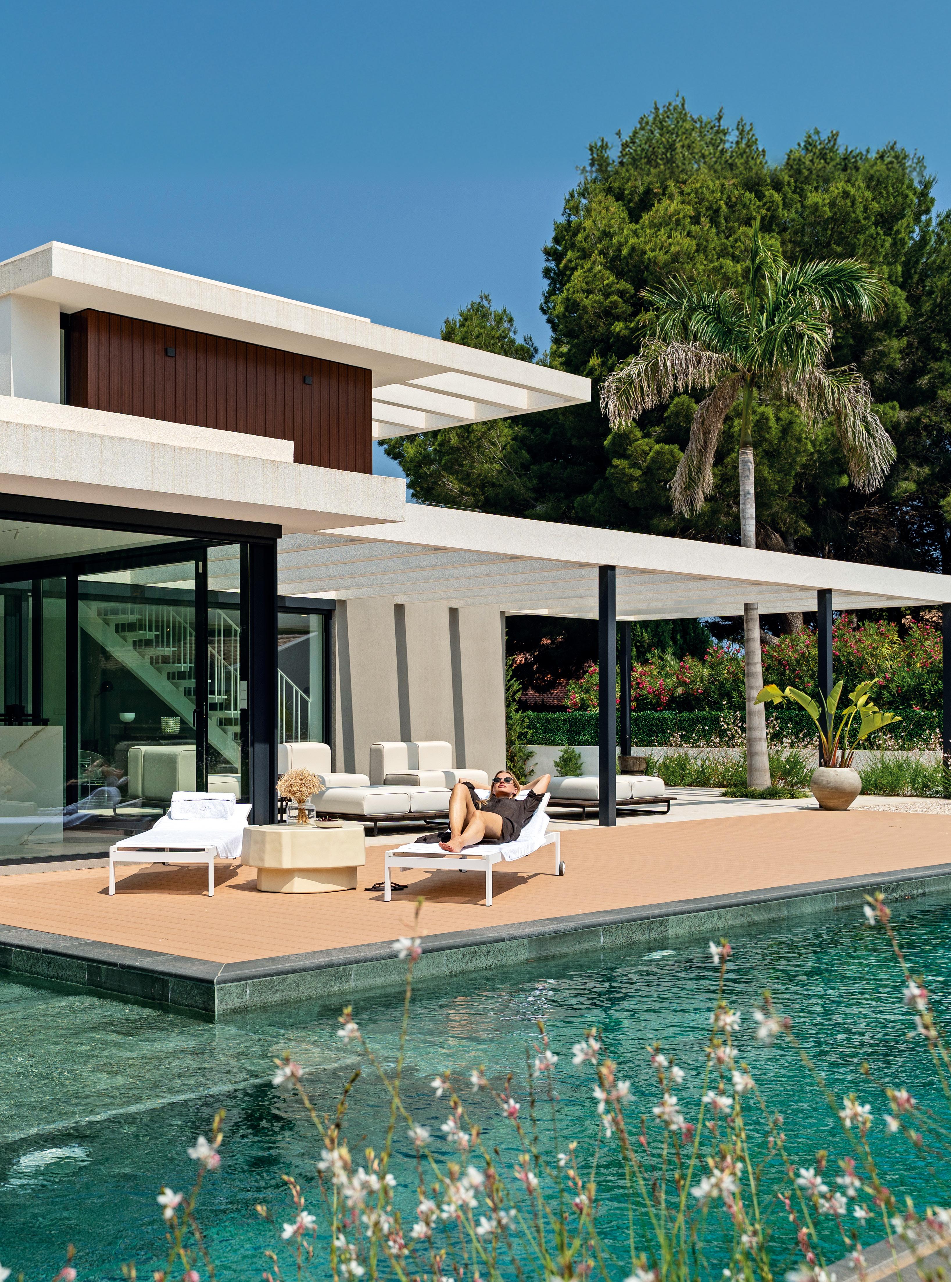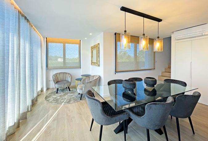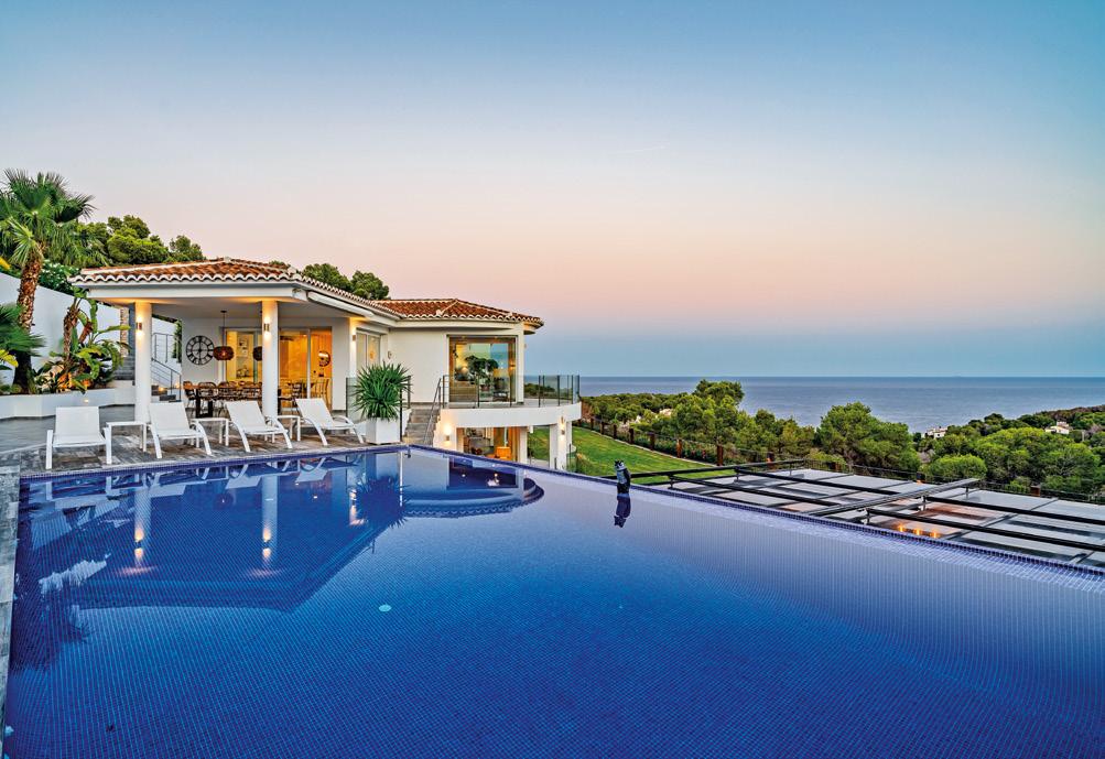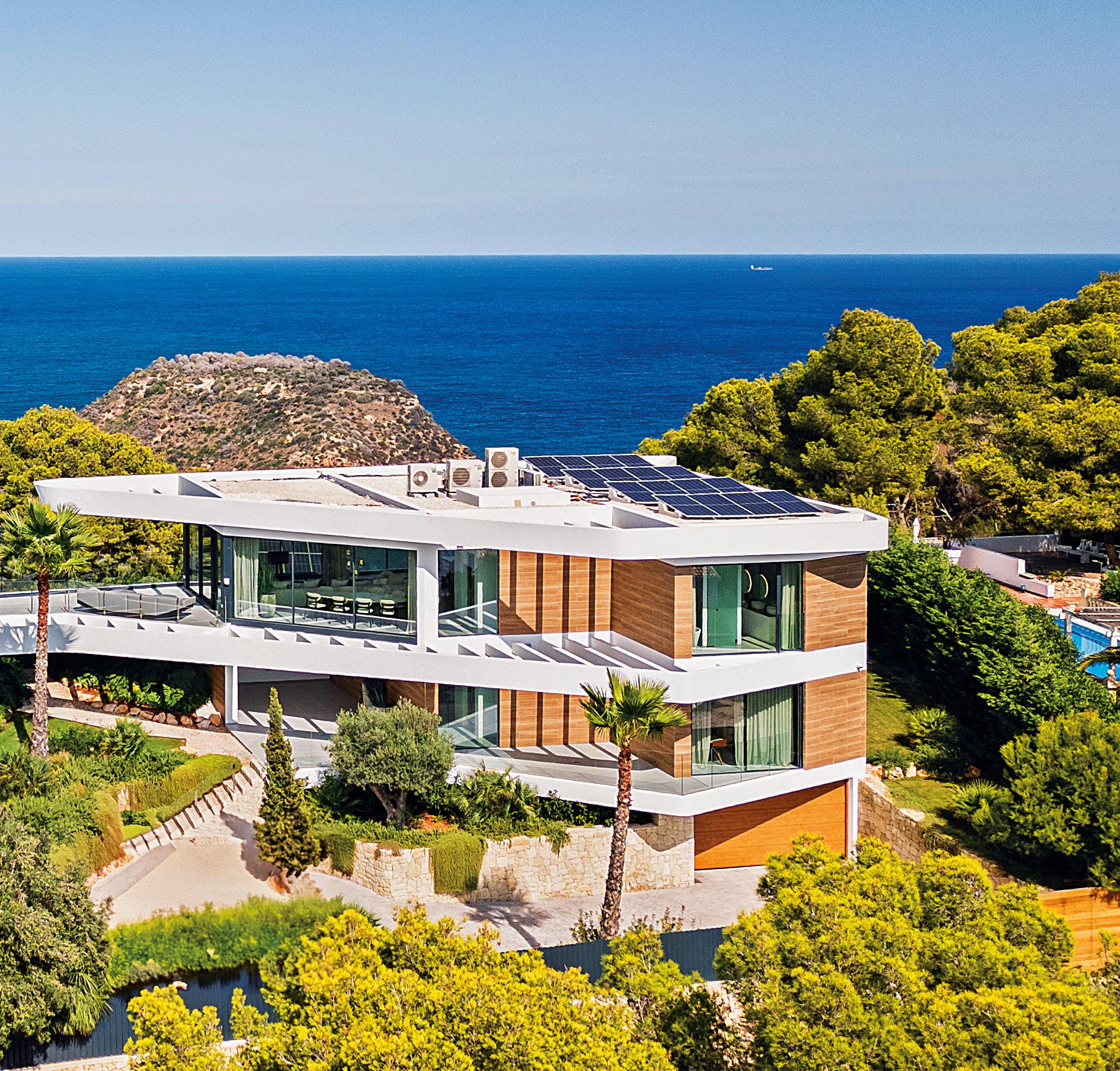 VILLA AGUAMARINA. Located in the exclusive Mar Azul residential area of Jávea, Villa Aguamarina enjoys breathtaking views of the Mediterranean, Portixol Island, Montgó and La Granadella Cove. Just steps from Portixol beach, it combines a cutting-edge design with clean lines and top-quality finishes, delivered fully furnished and ready to move into. On a 1,605 m² plot, its 420 m² are spread over twofloorsandabasementconnectedbyanelevator.4bedrooms,5 bathrooms,amastersuitewithwalk-incloset,over125m²ofterraces and a living room with panoramic windows opening to the sea. The kitchen with marble island and Siemens appliances flows into the dining area, while outdoors a 50 m² infinity pool with countercurrent system, chill-out, barbecue and Mediterranean garden set the scene for relaxation. With underfloor heating, air conditioning, home automation and alarm.