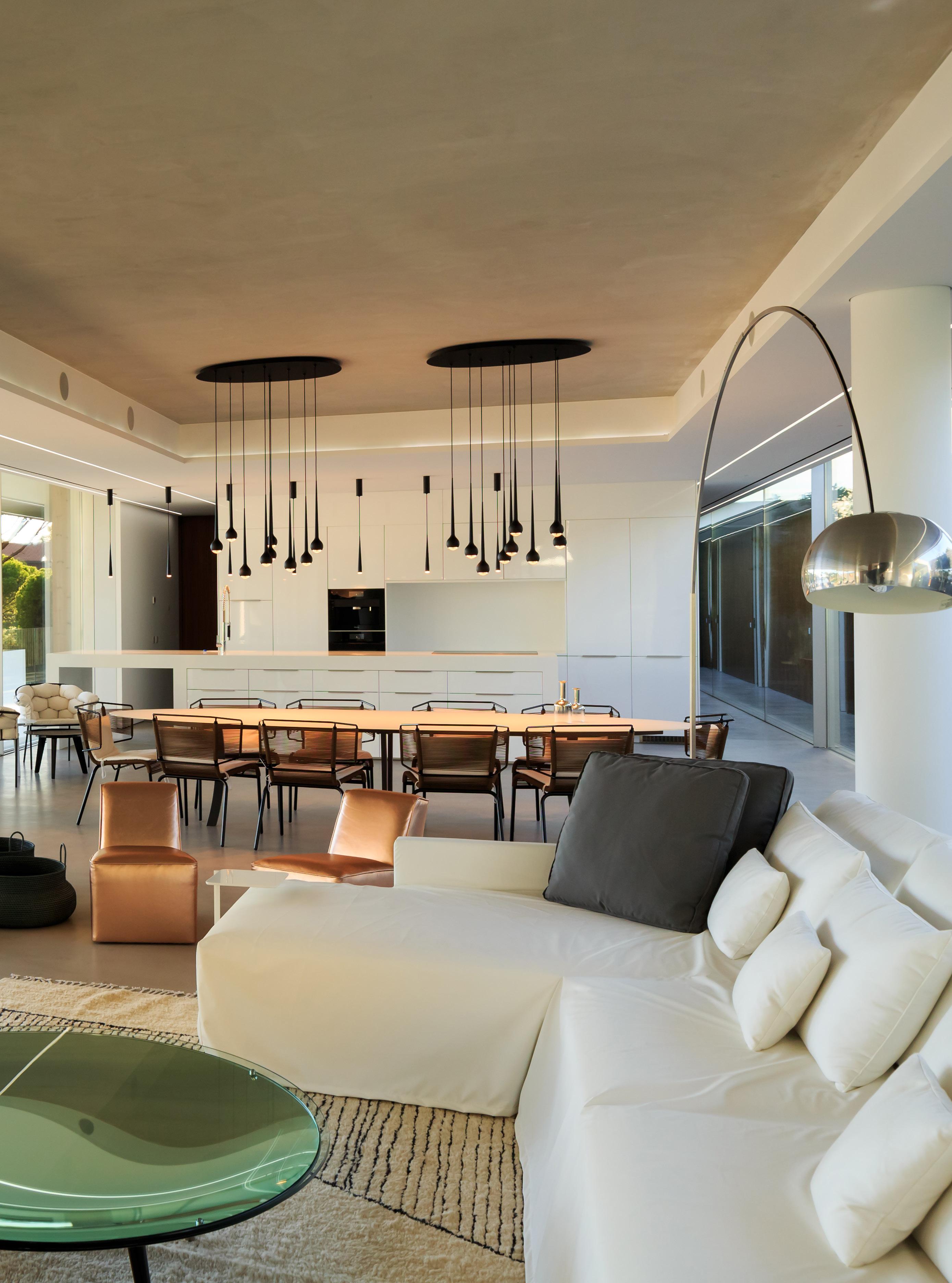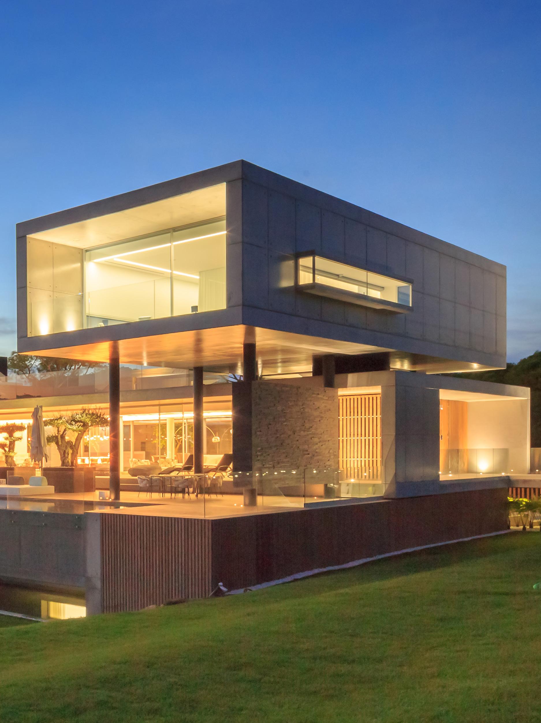 Unlago como paisaje diseña claramente la casa. El volumen principal se abre al paisaje con una luz de 47 metros libres. Minimizando al máximo cualquier elemento visual que distraiga la contemplación del paisaje, y también cualquier barrera física con el exterior. Por ello las grandes aperturas de cristales consiguen que el contacto con el entorno sea directo. Puedes estar en una habitación o en la cocina y sentir la libertad visual.