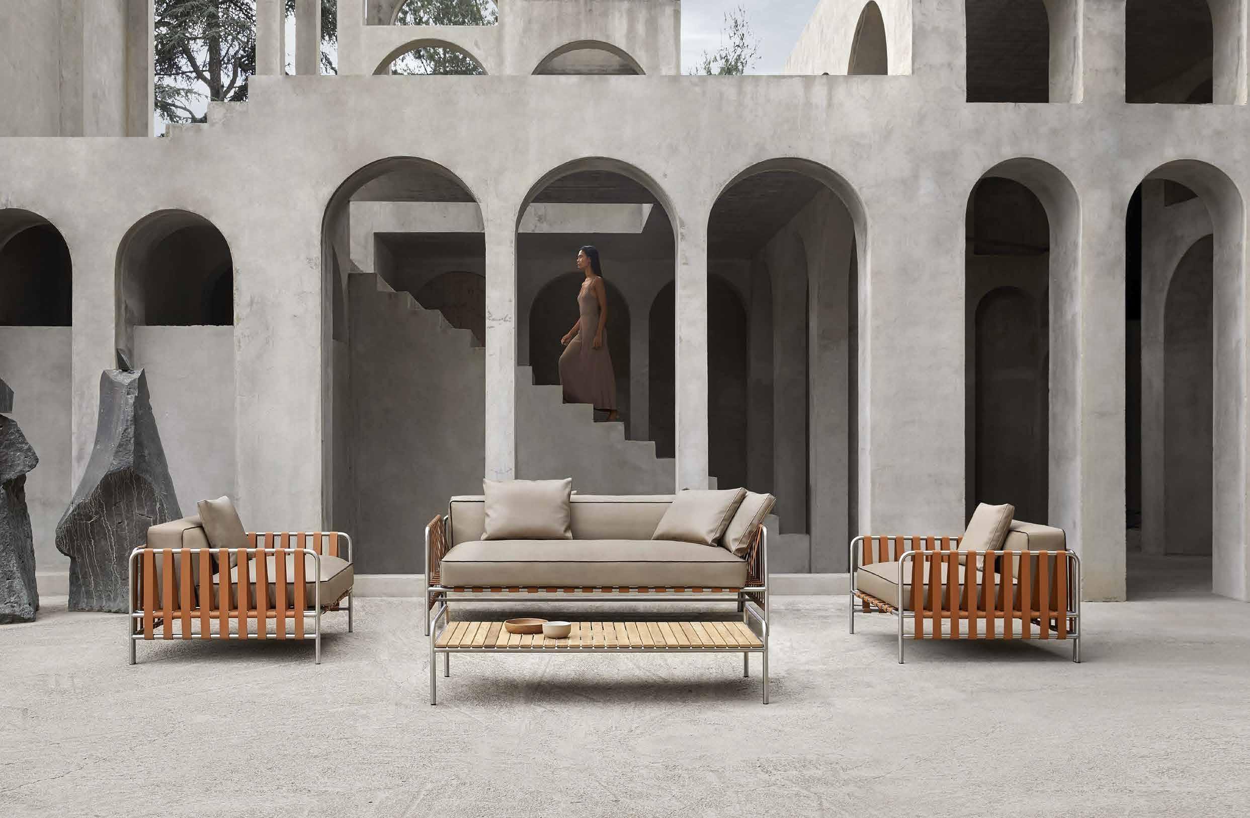 ONSEN é uma colecção de mobiliário de exterior de beleza serena onde o mais linear e essencial é carregado de singularidade em cada gesto. Uma colecção composta por poltrona Dining Club, sofá, poltrona lounge, sofás modulares e diferentes mesas baixas que combinam magistralmente estes diferentes materiais como aço inoxidável, cintas elásticas, alumínio e tecido em couro impermeável de alta performance, para integrá-los em perfeita harmonia.