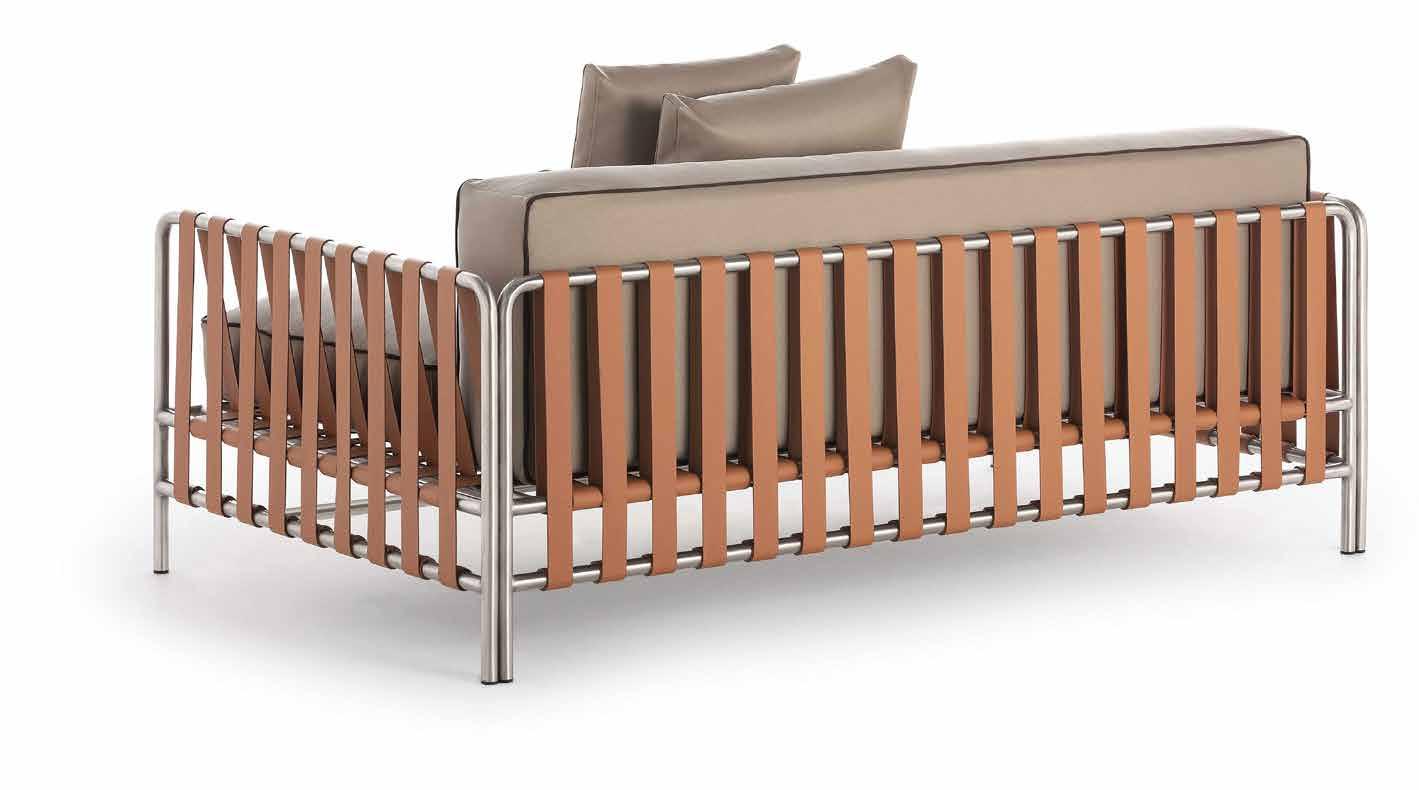 “A ideia foi gerar um contraste entre o tecido e a estrutura metálica junto com a geometria e transparência proporcionadas pelas tiras”, detalha Meda. Esse jogo entre a leveza e o calor proporcionados pelo alumínio e pelo couro, respectivamente, tornase a identidade da ONSEN concebida pelo designer milanês.