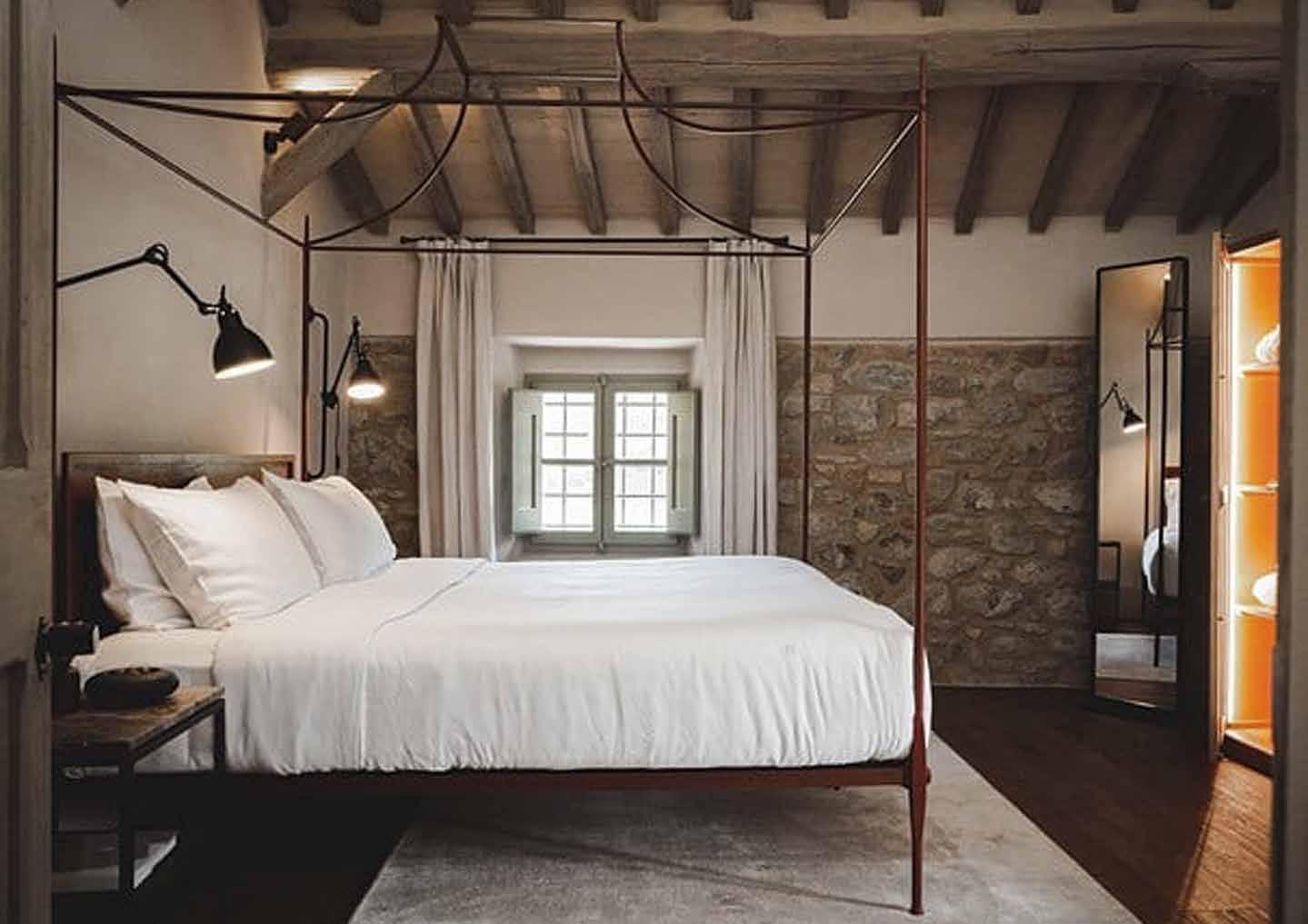 Dentro do mosteiro, oito quartos e suítes exclusivos apresentam móveis personalizados de Samarreda e Tosconova, camas com dossel de Lispi, uma paleta de cores distinta e obras de artistas locais. Os amplos banheiros apresentam azulejos personalizados ricamente coloridos feitos por Cotto Etrusco. A maioria das suítes vem com uma banheira profunda em balanço, às vezes situada do lado de fora na varanda espaçosa, onde as cortinas sopradas pela brisa oferecem sombra. Um edifício anexo separado abriga mais quatro quartos e suítes, cada um com seu próprio jardim e móveis externos da Varaschin.