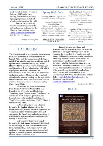 February 2015 Cork branch activities resume in February 2015 and we are looking forward to an exciting Spring programme, details of which can be found on the right. We are always looking for new members and all up to date notices can be found on the Classical Association website (www.classicalassociation.ie) and the Facebook page. Jennifer O’Donoghue