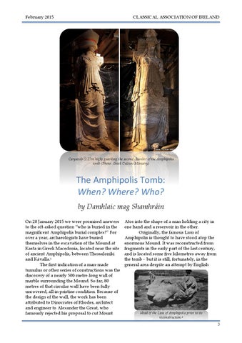 The Amphipolis Tomb: When? Where? Who? by Damhlaic mag Shamhráin On 20 January 2015 we were promised answers to the oft-asked question “who is buried in the magnificent Amphipolis burial complex?” For over a year, archaeologists have busied themselves in the excavation of the Mound at Kasta in Greek Macedonia, located near the site of ancient Amphipolis, between Thessaloniki and Kávalla.1 The first indication of a man-made tumulus or other series of constructions was the discovery of a nearly 500-metre-long wall of marble surrounding the Mound. So far, 80 metres of that circular wall have been fully uncovered, all in pristine condition. Because of the design of the wall, the work has been attributed to Dinocrates of Rhodes, architect and engineer to Alexander the Great, who famously rejected his proposal to cut Mount