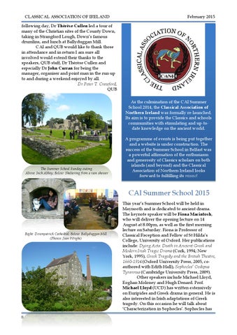 following day, Dr Thérèse Cullen led a tour of many of the Christian sites of the County Down, taking in Strangford Lough, Down’s famous drumlins, and lunch at Ballyduggan Mill. CAI and QUB would like to thank those in attendance and in return I am sure all involved would extend their thanks to the speakers, QUB staff, Dr Thérèse Cullen and especially Dr John Curran for being the manager, organiser and point man in the run up to and during a weekend enjoyed by all. Dr Peter T. Crawford, QUB As the culmination of the CAI Summer School 2014, the Classical Association of Northern Ireland was formally re-launched. Its aim is to provide the Classics and schools communities with stimulating and up-todate knowledge on the ancient world.