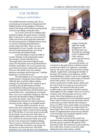 CAI DUBLIN Outing to south Wicklow On a bright Saturday morning, May 28, an excited group of prospective antiquarians left Belfield at 9am for the delights of Wicklow, armed with maps and brochures giving details of towns and villages along the route. At 11.30 we arrived at Coollattin (also spelled Coolattin, the name means ‘secluded place of the gorse’), where we were treated to coffee and scones at the golf club restaurant. We then proceeded to Coollattin House down an avenue of flaming rhododendrons – purple, pink and white. There we were entertained by Gerry Cassidy, who not only showed us the house but gave us a lively account of the Fitzwilliam family. Lord Fitzwilliam owned one-fifth of County Wicklow in the nineteenth century. His ancestor, Wentworth (known as ‘thorough’) had come from England to get money for his master and was granted land in Wicklow and Kildare. He was executed some years before his master suffered the same fate. However, the family survived, making judicious marriages and having sons – whether legitimate or not is hard to say! The Fitzwilliams were very good to their 20,000 tenants. During the Great Famine of the 1840s the then Lord Fitzwilliam called a meeting. He asked those who wanted to go to Canada to put up their hands and then provided them with good boats and money. Gerry told us that the less well-off tenants were excused their rent – including his own family. They were very considerate employers: this was shown by the beautiful village of Shillelagh owned by the family, where they built substantial stone houses for their employees and laid out the village on an English model. The house itself is enormous. It was built in the early nineteenth century, replacing a Georgian house which was burnt down during the 1798 rebellion. It was only used occasionally by the family who lived most of the time on their English estates. However, the whole area was noted for its oak forests which were used for the roofs of many fine English buildings. There is a grove of primeval oak trees on the estate. When that was sold to a developer, he decided to cut down the trees. The locals protested, to no avail: the trees were marked for