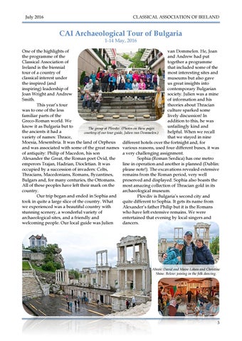One of the highlights of van Dommelen. He, Joan the programme of the and Andrew had put Classical Association of together a programme Ireland is the biennial that included some of the tour of a country of most interesting sites and classical interest under museums but also gave the inspired (and us great insights into inspiring) leadership of contemporary Bulgarian Joan Wright and Andrew society. Julien was a mine Smith. of information and his This year’s tour theories about Thracian was to one of the less culture sparked some familiar parts of the lively discussion! In Greco-Roman world. We addition to this, he was know it as Bulgaria but to unfailingly kind and The group at Plovdiv. (Photos on these pages the ancients it had a helpful. When we recall courtesy of our tour guide, Julien van Dommelen.) variety of names: Thrace, that we stayed in nine Moesia, Mesembria. It was the land of Orpheus different hotels over the fortnight and, for and was associated with some of the great names various reasons, used four different buses, it was of antiquity: Philip of Macedon, his son a very challenging assignment. Alexander the Great, the Roman poet Ovid, the Sophia (Roman Serdica) has one metro emperors Trajan, Hadrian, Diocletian. It was line in operation and another is planned (Dublin: occupied by a succession of invaders: Celts, please note!). The excavations revealed extensive Thracians, Macedonians, Romans, Byzantines, remains from the Roman period, very well Bulgars and, for many centuries, the Ottomans. preserved and displayed. Sophia also boasts the All of these peoples have left their mark on the most amazing collection of Thracian gold in its country. archaeological museum. Our trip began and ended in Sophia and Plovdiv is Bulgaria’s second city and took in quite a large slice of the country. What quite different to Sophia. It gets its name from we experienced was a beautiful country with Alexander’s father Philip but it is the Romans stunning scenery, a wonderful variety of who have left extensive remains. We were archaeological sites, and a friendly and entertained that evening by local singers and dancers. welcoming people. Our local guide was Julien