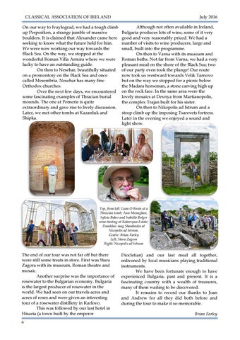 CLASSICAL ASSOCIATION OF IRELAND On our way to Ivaylograd, we had a tough climb up Perperikon, a strange jumble of massive boulders. It is claimed that Alexander came here seeking to know what the future held for him. We were now working our way towards the Black Sea. On the way, we stopped at the wonderful Roman Villa Armira where we were lucky to have an outstanding guide. On then to Nesebar, beautifully situated on a promontory on the Black Sea and once called Mesembria. Nesebar has many fine Orthodox churches. Over the next few days, we encountered some fascinating examples of Thracian burial mounds. The one at Pomerie is quite extraordinary and gave rise to lively discussion. Later, we met other tombs at Kazanluk and Shipka.