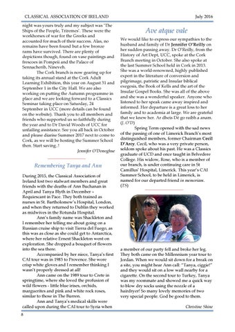 Ave atque vale We would like to express our sympathies to the husband and family of Dr Jennifer O’Reilly on her sudden passing away. Dr O’Reilly, from the History of Art Dept, UCC, spoke at the Cork Branch meeting in October. She also spoke at the last Summer School held in Cork in 2013. She was a world-renowned, highly published expert in the literature of conversion and pilgrimage, patristic and Insular biblical exegesis, the Book of Kells and the art of the Insular Gospel Books. She was all of the above and she was a wonderful speaker. Anyone who listened to her speak came away inspired and informed. Her departure is a great loss to her family and to academia at large. We are grateful that we knew her. Ar dheis Dé go raibh a anam. (J. O’D) Spring Term opened with the sad news of the passing of one of Limerick Branch’s most distinguished members, former Chairman Cecil D’Arcy. Cecil, who was a very private person, seldom spoke about his past. He was a Classics graduate of UCD and once taught in Belvedere College. His widow, Rose, who is a member of our branch, is under continuing care in St Camillus’ Hospital, Limerick. This year’s CAI Summer School, to be held in Limerick, is named for our departed friend in memoriam. (TS)