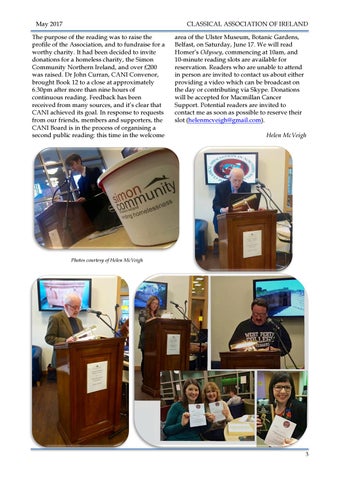 area of the Ulster Museum, Botanic Gardens, Belfast, on Saturday, June 17. We will read Homer’s Odyssey, commencing at 10am, and 10-minute reading slots are available for reservation. Readers who are unable to attend in person are invited to contact us about either providing a video which can be broadcast on the day or contributing via Skype. Donations will be accepted for Macmillan Cancer Support. Potential readers are invited to contact me as soon as possible to reserve their slot (helenmcveigh@gmail.com). Helen McVeigh