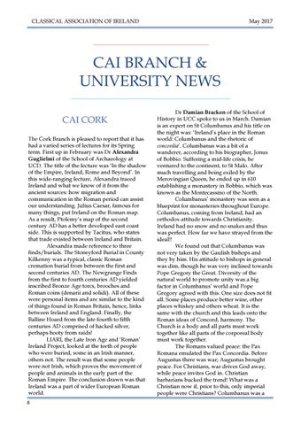 CAI BRANCH & UNIVERSITY NEWS CAI CORK The Cork Branch is pleased to report that it has had a varied series of lectures for its Spring term. First up in February was Dr Alexandra Guglielmi of the School of Archaeology at UCD. The title of the lecture was ‘In the shadow of the Empire, Ireland, Rome and Beyond’. In this wide-ranging lecture, Alexandra traced Ireland and what we know of it from the ancient sources: how migration and communication in the Roman period can assist our understanding. Julius Caesar, famous for many things, put Ireland on the Roman map. As a result, Ptolemy’s map of the second century AD has a better developed east coast side. This is supported by Tacitus, who states that trade existed between Ireland and Britain. Alexandra made reference to three finds/burials. The Stoneyford Burial in County Kilkenny was a typical, classic Roman cremation burial from between the first and second centuries AD. The Newgrange Finds from the first to fourth centuries AD yielded inscribed Bronze Age torcs, brooches and Roman coins (denarii and solidi). All of these were personal items and are similar to the kind of things found in Roman Britain, hence, links between Ireland and England. Finally, the Balline Hoard from the late fourth to fifth centuries AD comprised of hacked silver, perhaps booty from raids! LIARI, the Late Iron Age and ‘Roman’ Ireland Project, looked at the teeth of people who were buried, some in an Irish manner, others not. The result was that some people were not Irish, which proves the movement of people and animals in the early part of the Roman Empire. The conclusion drawn was that Ireland was a part of wider European Roman world. 8