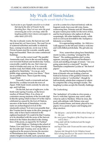 My Walk of Simichidas: Remembering the seventh Idyll of Theocritus Such nectar as you Nymphs mixed for us to drink that day by the altar of Demeter by the threshing floor. May I set once more the great winnowing fan on her corn heap, while the laughing goddess bears sheaves and poppies in either hand. (153-157) The day is already warm, the harvest sun well up (it must be), as I leave town. The road I’m on is scattered-suburban and traffic is relatively busy, coming towards me, on its way to Kos. Private houses stud the wayside, usually quite large and beautiful. There are some commercial buildings. Am I on the correct road? The parallel Ammoudia road, close to the sea and looking over towards Bodrum and modern-day Turkey, conceivably could be the one. But I clear my mind of doubts and carry on. It is a smooth, modern road, but I think of the words of the goatherd to Simichidas: “As you go, each pebble sings spinning from your shoes.” There are no pebbles here. There is just the rising August heat. Presently I reach a crossroads and am directed by a soldier towards the town of Zipari. With frank Greek curiosity he asks my age, and I tell him. On the left, but out of sight now, is the fresh-water spring Vourina, on the lower reaches of Mount Dikeo. It is a bone of contention among students of the Seventh Idyll. Is this the spring which in lines 6-9 of the Idyll is celebrated as caused by the foot of Chalcon, ancestor of the hosts of Simichidas, or is its name an archaeological revival of the nineteenth century? Is it not even possible that this Vourina lost its name in the slow passage of time, only to have had it restored in the eighteen hundreds? Or could it be that Vourina is to be identified with the scene of the harvest festival in the Haleis described in the closing lines of the poem, as argued by M. Puelma? I don’t think so. I belong to the school of Patton, Gow and Dover. Two springs feature in the Seventh Idyll. Vourina, now on my left, is employed in the poem to heroise the ancestor of Phrasidamus and Antigones. Given its relative height it is hardly such a practical place 2