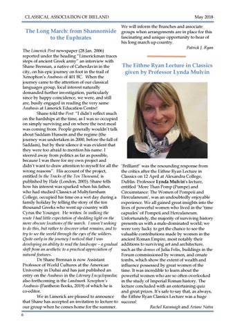 The Long March: from Shannonside to the Euphrates The Limerick Post newspaper (28 Jan. 2006) reported under the heading “Limerickman traces steps of ancient Greek army” an interview with Shane Brennan, a native of Caherdavin in the city, on his epic journey on foot in the trail of Xenophon’s Anabasis of 401 BC. When the journey came to the attention of our classical languages group, local interest naturally demanded further investigation, particularly since by happy coincidence, we were, and still are, busily engaged in reading the very same Anabasis at Limerick Education Centre! Shane told the Post: “I didn’t reflect much on the hardships at the time, as I was so occupied on simply surviving and on where the next meal was coming from. People generally wouldn’t talk about Saddam Hussein and the regime (the journey was undertaken in 2000, before the fall of Saddam), but by their silence it was evident that they were too afraid to mention his name. I steered away from politics as far as possible, because I was there for my own project and didn’t want to draw attention to myself for all the wrong reasons”. His account of the project, entitled In the Tracks of the Ten Thousand, is published by Hale (London, 2005). Shane tells how his interest was sparked when his father, who had studied Classics at Multyfarnham College, occupied his time on a wet day during a family holiday by telling the story of the ten thousand Greeks who went up country with Cyrus the Younger. He writes: In walking the route I had little expectation of shedding light on the more obscure locations of the march. I wasn’t seeking to do this, but rather to discover what remains, and to try to see the world through the eyes of the soldiers. Quite early in the journey I noticed that I was developing an ability to read the landscape – a gradual shift from an aesthetic to a practical appreciation of natural features. Dr Shane Brennan is now Assistant Professor of World Cultures at the American University in Dubai and has just published an entry on the Anabasis in the Literary Encyclopaedia; also forthcoming is the Landmark Xenophon’s Anabasis (Pantheon Books, 2019) of which he is co-editor. We in Limerick are pleased to announce that Shane has accepted an invitation to lecture to our group when he comes home for the summer. 6
