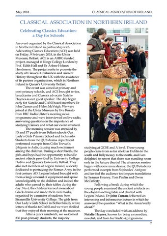 CLASSICAL ASSOCIATION IN NORTHERN IRELAND Celebrating Classics Education: a Day for Schools An event organised by the Classical Association in Northern Ireland in partnership with Advocating Classics Education (ACE) was held on Friday, 9 February 2018, in the Ulster Museum, Belfast. ACE is an AHRC-funded project, managed at Kings College London by Prof. Edith Hall and Dr Arlene Holmes Henderson. The project seeks to promote the study of Classical Civilisation and Ancient History throughout the UK with the assistance of its partner organisations, which in Northern Ireland is Queen’s University Belfast. The event was aimed at primary and post-primary schools, and ACE brought writer, broadcaster and Classics advocate Natalie Haynes as our guest speaker. The day began early for Natalie and CANI board members Dr John Curran and Helen McVeigh. We were joined at the Ulster Museum by Eve Rosato from BBC Radio Ulster’s morning news programme and were interviewed on live radio, answering questions on the importance of studying Classics and what our event involved. The morning session was attended by P5 and P7 pupils from Belfast schools Our Lady’s Girls Primary School and Inchmarlo. Students from the QUB drama department performed excerpts from Colin Teevan’s Iphigenia in Aulis, causing much excitement among the children. During a short break, the girls and boys had the opportunity to handle ancient objects provided by University College Dublin and Queen’s University Belfast. They also met members of Legion Ireland, a society dedicated to portraying the Roman Army in the first century AD. Legion Ireland brought with them a large amount of equipment and spoke knowledgeably to the children and indeed the adults who passed by their tables during the day. Next, the children learned more about Greek drama and made their own masks, organised by a number of students from Stranmillis University College. The girls from Our Lady’s Girls School in Belfast kindly wrote letters of thanks to CANI and we were thrilled that they enjoyed their morning at the museum. After a quick sandwich, we welcomed 230 post-primary students, the majority