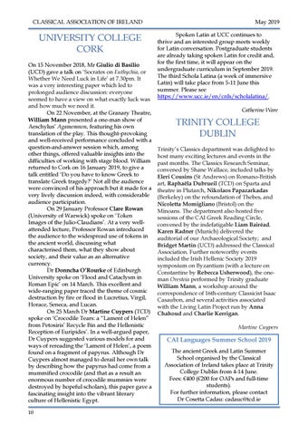 TRINITY COLLEGE DUBLIN Trinity’s Classics department was delighted to host many exciting lectures and events in the past months. The Classics Research Seminar, convened by Shane Wallace, included talks by Eleri Cousins (St Andrews) on Romano-British art, Raphaëla Dubrueil (TCD) on Sparta and theatre in Plutarch, Nikolaos Papazarkadas (Berkeley) on the refoundation of Thebes, and Nicoletta Momigliano (Bristol) on the Minoans. The department also hosted five sessions of the CAI Greek Reading Circle, convened by the indefatigable Liam Bairéad. Karen Radner (Munich) delivered the auditorial of our Archaeological Society; and Bridget Martin (UCD) addressed the Classical Association. Further noteworthy events included the Irish Hellenic Society 2019 symposium on Byzantium (with a lecture on Constantine by Rebecca Usherwood), the oneman Oresteia performed by Trinity graduate William Mann, a workshop around the correspondence of 16th-century Classicist Isaac Casaubon, and several activities associated with the Living Latin Project run by Anna Chahoud and Charlie Kerrigan. Martine Cuypers