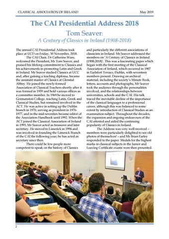 The annual CAI Presidential Address took place at UCD on Friday, 30 November, 2018. The CAI Chair, Dr Catherine Ware, welcomed the President, Mr Tom Seaver, and praised his lifelong commitment to Classics and his achievements in promoting Latin and Greek in Ireland. Mr Seaver studied Classics at UCC and, after gaining a teaching diploma, became the assistant master of Classics at Glenstal Abbey. He joined the newly-formed Association of Classical Teachers shortly after it was formed in 1959 and held various offices as a committee member. In 1969 he moved to Gormanston College, teaching Latin, Greek and Classical Studies, but remained involved in the ACT. He was active in setting up the Dublin branch in 1970, serving as president in 19761977, and in the mid-seventies became editor of the Association Handbook until 1992. When the ACT joined the Classical Association of Ireland in 1993, Mr Seaver acted as treasurer and later secretary. He moved to Limerick in 1994 and was involved in founding the Limerick Branch of the CAI the following year; he has acted as secretary since then. There could be few people more competent to speak on the history of Classics