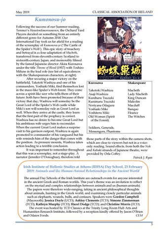 Irish Institute of Hellenic Studies at Athens (IIHSA) Day School, 23 February 2019: Animals and Us: Human-Animal Relationships in the Ancient World The annual Day Schools of the Irish Institute are outreach events for anyone interested in the ancient Greek and Roman worlds. This year’s theme was an invitation to reflect on the myriad and complex relationships between animals and us (human-animals). The papers were therefore wide-ranging, taking in ancient philosophical thoughts about animals, hunting in the Greek world, and examining closely particular animals such as elephants, weasels, bulls, and centaurs. Speakers were Gordon Campbell (Maynooth); Jessica Doyle (UCD); Ashley Clements (TCD); Simone Zimmerman (TCD); Kathryn Murphy (TCD); Hazel Dodge (TCD); and Christine Morris (TCD). The event was hosted by TCD Classics at the Trinity Long Room Hub Arts and Humanities Research Institute, followed by a reception kindly offered by Jason O’Brien and Odaios Foods. CEM 5