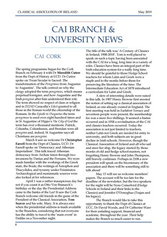 CAI BRANCH & UNIVERSITY NEWS CAI CORK The spring programme began for the Cork Branch on February 4 with Dr Meredith Cutrer from the Dept of History at UCD. Dr Cutrer spoke on ‘From Secular to Sacred: The transformation of the Peregrinus from Augustus to Augustine’. The talk centred on why the clergy adopted the term peregrinus, which means perpetual foreigner, and how Augustine and the Irish peregrini after him understood their role. The term showed no respect of class or religion and in 212AD Caracalla’s Edict granted to all those in the Roman world the citizenship of the Romans. In the Epistle to Diognetus the term peregrinus is used over eight hundred times and in St Augustine of Hippo’s The City of God the term has over a thousand mentions. Patrick, Columba, Columbanus, and Brendan were all peregrini and, indeed, St Augustine says all Christians are peregrini. March 4 saw us welcome Dr Christopher Farrell from the Dept of Classics, UCD. Dr Farrell spoke on ‘Democracy and Athenian Imperialism’. This talk traced Athenian democracy from Archaic times through two invasions by Darius and the Persians. We were made familiar with the workings of the Greek state, the Boule, the writings of Xenophon and Thucydides, and tyranny under Peisistratos. Archaeological and numismatic sources were also looked at for references. April 1 was a rather inauspicious day but not if you count it as Otto Von Bismarck’s birthday or the day the Presidential Address came to the banks of the Lee! It saw the Cork Branch welcome old friends in the guise of the President of the Classical Association, Tom Seaver and his wife, Mary. It is always nice when the presidential address is made available to the Branches, considering that not everyone has the ability to travel to the ‘main event’ in Dublin on a November night. 8