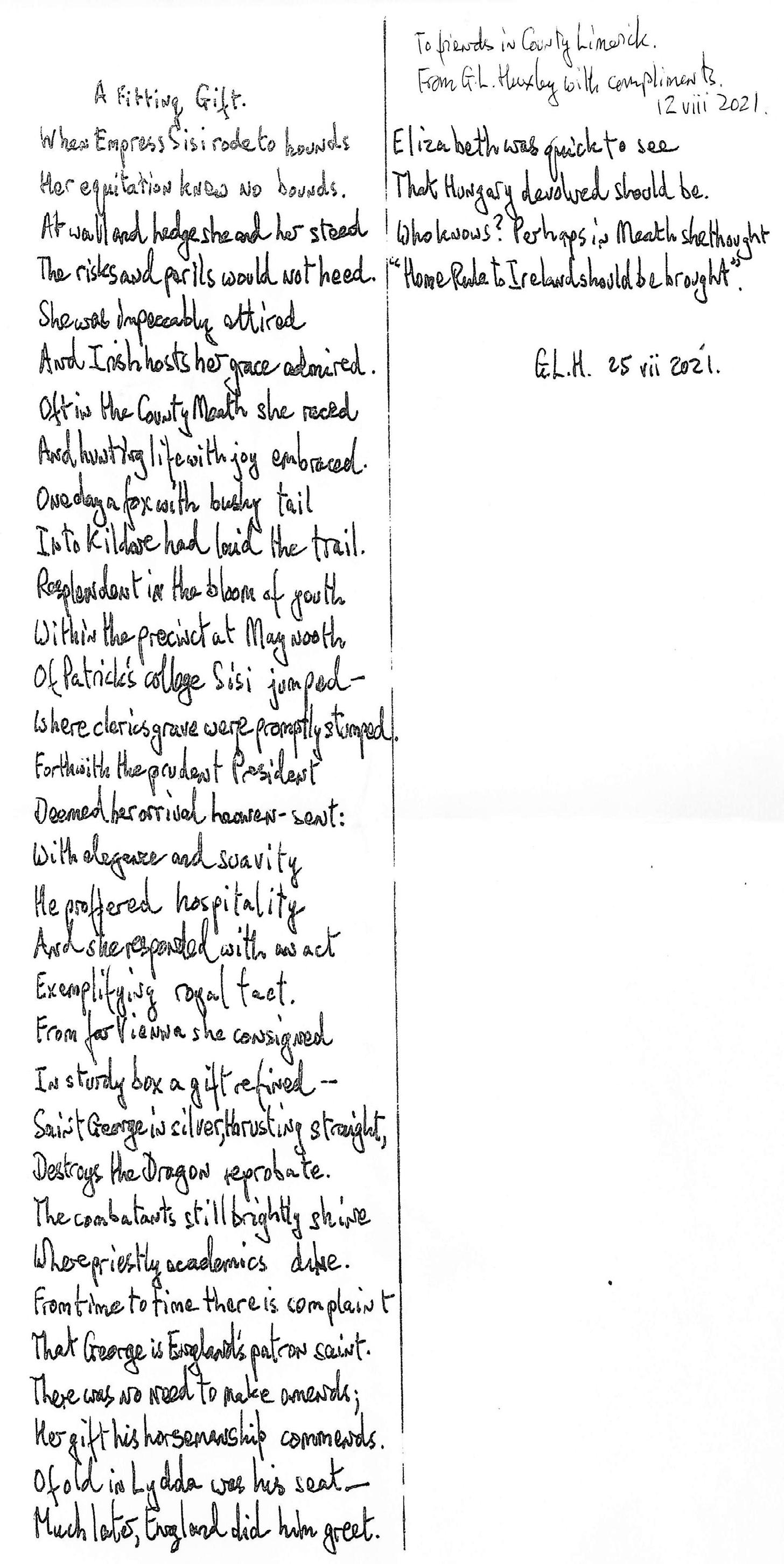 Branch members were deeply saddened by the passing of Professor Emeritus George Leonard Huxley. George, as he was known to us, had been a frequent visitor and speaker at the Limerick Branch over a period of twentythree years and had taken all our members to his heart. He dedicated several of his verses, written deftly and most amusingly in Iambic tetrameters, to the Branch (at right). As we mull over them now, a line from Virgil’s Aeneid might be an appropriate reminder of the man himself: