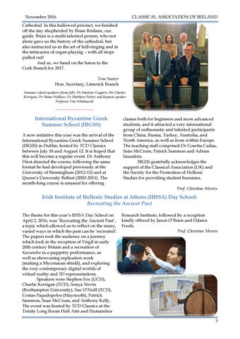 Cathedral. In this hallowed precinct, we finished off the day shepherded by Brian Brislane, our guide. Brian is a multi-talented person, who not alone gave us the history of the cathedral, but also instructed us in the art of bell-ringing and in the intricacies of organ-playing – with all stops pulled out! And so, we hand on the baton to the Cork Branch for 2017. Tom Seaver Hon. Secretary, Limerick Branch Summer school speakers (from left): Dr Martine Cuypers; Mr Charles Kerrigan; Dr Shane Wallace; Dr Matthew Potter; and keynote speaker Professor Tim Whitmarsh.
