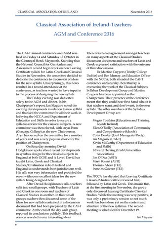 Classical Association of Ireland-Teachers AGM and Conference 2016