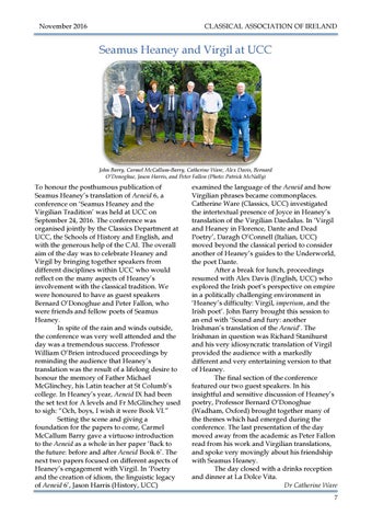 examined the language of the Aeneid and how Virgilian phrases became commonplaces. Catherine Ware (Classics, UCC) investigated the intertextual presence of Joyce in Heaney’s translation of the Virgilian Daedalus. In ‘Virgil and Heaney in Florence, Dante and Dead Poetry’, Daragh O’Connell (Italian, UCC) moved beyond the classical period to consider another of Heaney’s guides to the Underworld, the poet Dante. After a break for lunch, proceedings resumed with Alex Davis (English, UCC) who explored the Irish poet’s perspective on empire in a politically challenging environment in ‘Heaney’s difficulty: Virgil, imperium, and the Irish poet’. John Barry brought this session to an end with ‘Sound and fury: another Irishman’s translation of the Aeneid’. The Irishman in question was Richard Stanihurst and his very idiosyncratic translation of Virgil provided the audience with a markedly different and very entertaining version to that of Heaney. The final section of the conference featured our two guest speakers. In his insightful and sensitive discussion of Heaney’s poetry, Professor Bernard O’Donoghue (Wadham, Oxford) brought together many of the themes which had emerged during the conference. The last presentation of the day moved away from the academic as Peter Fallon read from his work and Virgilian translations, and spoke very movingly about his friendship with Seamus Heaney. The day closed with a drinks reception and dinner at La Dolce Vita. Dr Catherine Ware 7