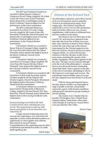 November 2017 The 2017 Jack Henderson medal was awarded to Julian Jimenez Ospina of Clongowes Wood College, taught by Mr Adam Conry (Mr Chris Lumn, School Principal). Julian attained the overall highest mark of Junior Certificate Classical subjects for his performance in the Latin examination. The 2017 Centennial Medal was awarded to Eva Glynn of Loreto College Foxrock, taught by Ms Louise Potter (Ms Bernadette Prendeville, School Principal). Eva attained the overall highest mark of Leaving Certificate Classical subjects for her performance in the Classical Studies examination. A President’s Medal was awarded to Simon Wilson of Gonzaga College, taught by Ms Aryn Penn (Mr Damon McCaul, School Principal). Simon attained the highest mark in the Junior Certificate Ancient Greek examination. A President’s Medal was awarded to Liam Ryan of Gonzaga College, taught by Ms Aryn Penn (Mr Damon McCaul, School Principal). Liam attained the highest mark in the Leaving Certificate Ancient Greek examination. A President’s Medal was awarded to Jill FitzPatrick of Holy Faith Secondary School, Clontarf, taught by Mr Ian Maguire (Ms Deirdre Gogarty, School Principal). Jill attained the highest mark in the Junior Certificate Classical Studies examination. A President’s Medal was awarded to James Gabriel Thomas Kelly of Blackrock College, taught by Ms Sara Henchy (Mr Alan MacGinty, School Principal). James attained the highest mark in the Leaving Certificate Latin examination. Final proceedings were held in the Staff Common Room where refreshments were served. This opportunity to catch up with friends and partake in lively discussion was enjoyed by all. A huge amount of planning and work was put into organising a very successful and enjoyable occasion which afforded members an opportunity to come together and celebrate their interest in ancient Classics. Congratulations to the organising team for their commitment and attention to detail. Go raibh maith agaibh go léir. Isabella Bolger