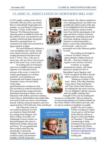 CLASSICAL ASSOCIATION IN NORTHERN IRELAND Latin student. The oldest contributors CANI’s public reading of the Iliad in were septuagenarians: my father was December 2016 proved so successful possibly the oldest reader of the day. that we immediately began plans for It was delightful to hear the timeless another: we read Homer’s Odyssey on story of Odysseus’ journey home Saturday, 17 June, in the Ulster from Troy told by participants of all Museum. The Museum has many ages and from a variety of diverse amazing spaces available for hire, but backgrounds, including school and the entrance foyer was perfect for our university students, teachers and reading, which took place during the lecturers, a retired journalist, a Museum’s opening hours: we doctor, a university administrator, commenced at 10am and concluded at civil servants – and we even approximately 4.30pm. persuaded one of the Museum guides We used Richmond Lattimore’s to read! verse translation and County Antrim The reading was brought to actor, Jimmy Kearney, started us off, a close by Dr John Curran at reading the famous first lines from approximately 4.30pm at book 23, book 1: Tell me, Muse, of the man of line 296: ...They then / Gladly went many ways, who was driven / far journeys, together to bed, and their old ritual. after he had sacked Troy’s sacred citadel. As before, we sought 36 reading slots of 10 minutes donations for charity. The Ulster each were available for hire and the Museum’s charity for 2017 is majority were allocated well in Macmillan Cancer Support, and advance of the event. A total of 34 CANI was glad to be able to donate readers participated, two of these £84.41 raised by Odyssey readers. remotely: Laura Jenkinson in Thanks go to all the CANI Portsmouth and Heather Parsons in team – Barry, Erin, John, Katerina, Tasmania. Laura, of Greek Myth Laura, Barry, Peter and Raoul – Comix fame and Clare at the Ulster Museum, (greekmythcomix.wordpress.com), for making the day such a success. also provided us with art activities for We are delighted with the exposure the young (and the young-at-heart!), that our public readings have including colouring-in sheets, cut-out brought CANI, and my mailing list Odysseus with clothes, and more relating has grown considerably. There is indeed an to the Odyssey. Both children and adults alike ever-growing audience in Northern Ireland for were active in the art corner, concentrating the events which CANI seeks to provide, and fiercely with the coloured markers, and were we aim to continue to heighten our public supervised by CANI stalwarts, Peter and Raoul. profile. Our next venture Like Odysseus, some of will be a reading of Virgil’s our readers journeyed over the Aeneid and we will be back sea: thanks to Mark McCahill CLICK TO WATCH in the McClay Library at for coming from Glasgow, and Laura Jenkinson read: Queen’s University Belfast Marco Palone, from Italy via on Thursday, 7 December, Edinburgh! Closer to home, we commencing at 10am. had participants who came to Donations from readers will Belfast from Dublin, Maynooth be sought for the Simon and Derry. We are grateful that Community NI. Contact me those readers made the trip (helenmcveigh@gmail.com) specifically to attend the to reserve a 10-minute reading. The youngest reader reading slot. on this occasion was Solomon https://youtu.be/6yZTGKdbE9c Trimble, a GCSE Greek and Helen McVeigh