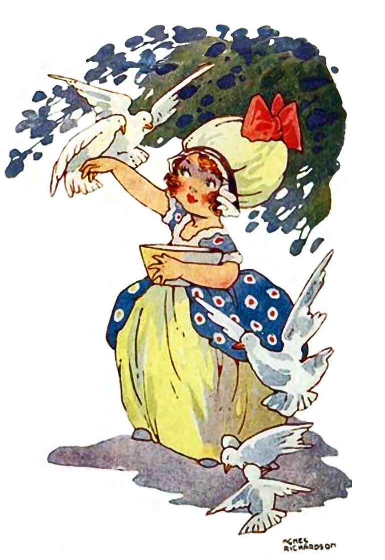 Oh what a sweet girl is wee Peggy Pearl. She is quite fond of her little bird flock. She feeds them nuts and seeds in the mor n at six o’clock. She named them Betty and Earl and Eddy and Merle. So kind a girl is wee Peggy Pearl.