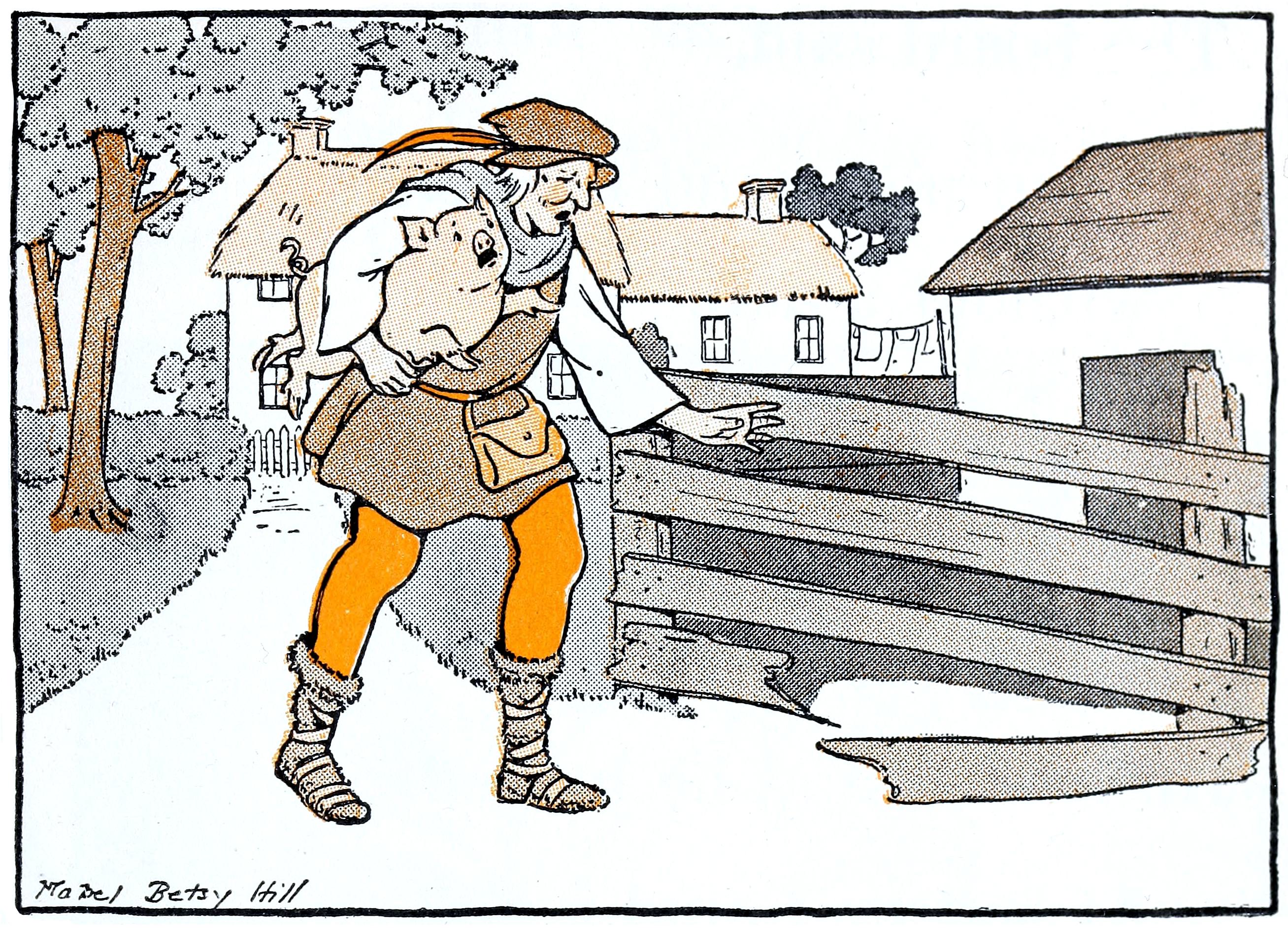 The little old man came to the fence where the little pig got out. The little old man said, “I will mend the fence. Oh, for a piece of wood, a piece of wood for me!”