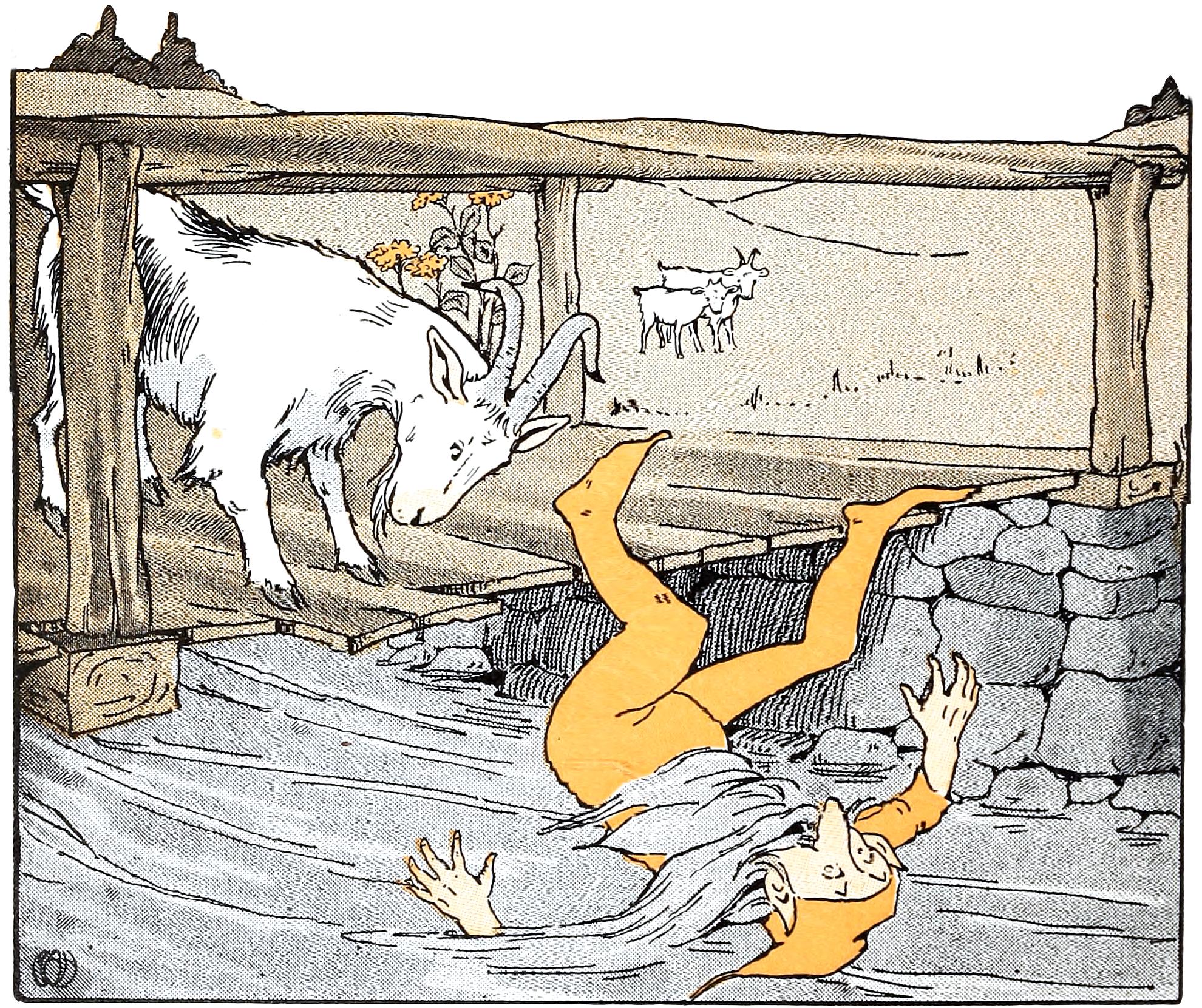 Piggie Wiggie jumped from under his arm and the little old man fell into the brook.