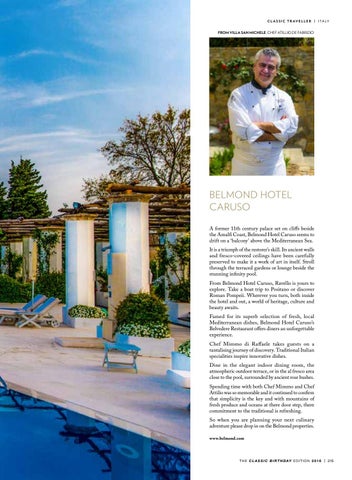 BELMOND HOTEL CARUSO A former 11th century palace set on cliffs beside the Amalfi Coast, Belmond Hotel Caruso seems to drift on a ‘balcony’ above the Mediterranean Sea. It is a triumph of the restorer’s skill. Its ancient walls and fresco-covered ceilings have been carefully preserved to make it a work of art in itself. Stroll through the terraced gardens or lounge beside the stunning infinity pool. From Belmond Hotel Caruso, Ravello is yours to explore. Take a boat trip to Positano or discover Roman Pompeii. Wherever you turn, both inside the hotel and out, a world of heritage, culture and beauty awaits. Famed for its superb selection of fresh, local Mediterranean dishes, Belmond Hotel Caruso’s Belvedere Restaurant offers diners an unforgettable experience. Chef Mimmo di Raffaele takes guests on a tantalising journey of discovery. Traditional Italian specialities inspire innovative dishes. Dine in the elegant indoor dining room, the atmospheric outdoor terrace, or in the al fresco area close to the pool, surrounded by ancient rose bushes. Spending time with both Chef Mimmo and Chef Attilio was so memorable and it continued to confirm that simplicity is the key and with mountains of fresh produce and oceans at there door step, there commitment to the traditional is refreshing. So when you are planning your next culinary adventure please drop in on the Belmond properties. www.belmond.com