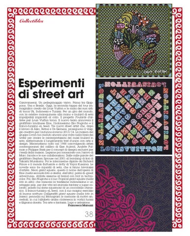 Caravanserai. Un pellegrinaggio visivo. Prima tra Giappone, Usa e Brasile. Oggi, la seconda tappa del tour immaginifico creato da Louis Vuitton e le mani dei suoi artisti tocca Uk, Indonesia e Tunisia. Per un giro del mondo, con la celebre maroquinerie alla mano e foulard di seta impalpabili impirolati al collo. Il progetto Foulards d’artistes par Louis Vuitton torna. Il nuovo team annovera il graffittaro londinese Eine, l’indonesiano Eko Nugroho e il franco-tunisino eL Seed. Tre nuovi street artist che, dopo il lavoro di Aiko, Retna e Os Gemeos, proseguono il viaggio creativo per l’autunno-inverno 2013/14. La maison del gruppo Lvmh ha creduto ancora una volta nella forza dei writer per creare le reinterpretazioni del maxi foulard in seta, riaffermando il lungimirante trait d’union con arte e design. Mecenatismo nato nel 1988 coinvolgendo artisti contemporanei del calibro di Gae Aulenti, Andrée Putman e Philippe Stark per il concept di disegni esclusivi per i tessili della maison. Legame poi consacrato con l’arrivo di Marc Jacobs e le sue collaborazioni. Dalle mille parole del graffittaro Stephen Sprouse nel 2001 al bombing di fiori di Takashi Murakami. Poi le infermierine dipinte da Richard Prince e il mondo fluttuante e dotty di Yayoi Kusama. Le novelle sono tre riquadri di seta, che si fanno tavolozza d’artista. Neon giant square, questo il nome dell’opera di Eine (nella seconda foto a destra, dall’alto), parla di «great adventures», strillate assieme al brand con font in technicolor. Poi, Eko Nugroho e il suo Tropical giant square (nella foto in alto), che mescola la tradizione indonesiana e un retaggio pop, per dar vita ad animale fantasy e super colorato, posato sul dorso squamoso di un coccodrillo chimerico. Il franco-tunisino eL Seed, con il suo magno esercizio di buona scrittura Calligraffiti giant square (nella foto in basso), pennella sul Monogram le memorie di motivi ancestrali, in cui l’alfabeto arabo s’interseca in vortici fucsia e filigrana dorata. Tra arte e fantasia. Logo e astrazione. Francesca Manuzzi