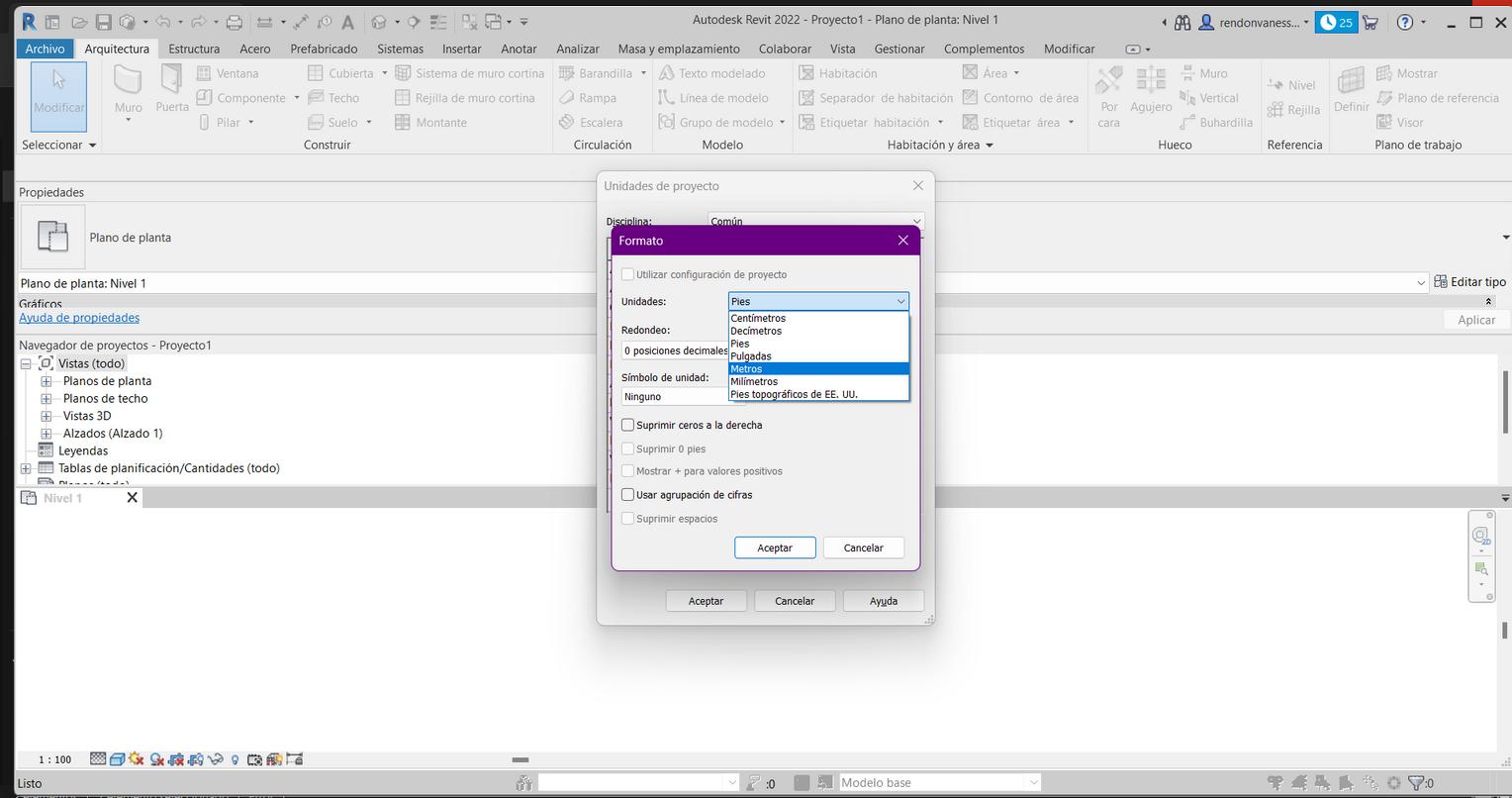 Seleccionamos la unidad de medidas "metros", 2 posiciones de redondeo, con símbolo de unidad en "m".