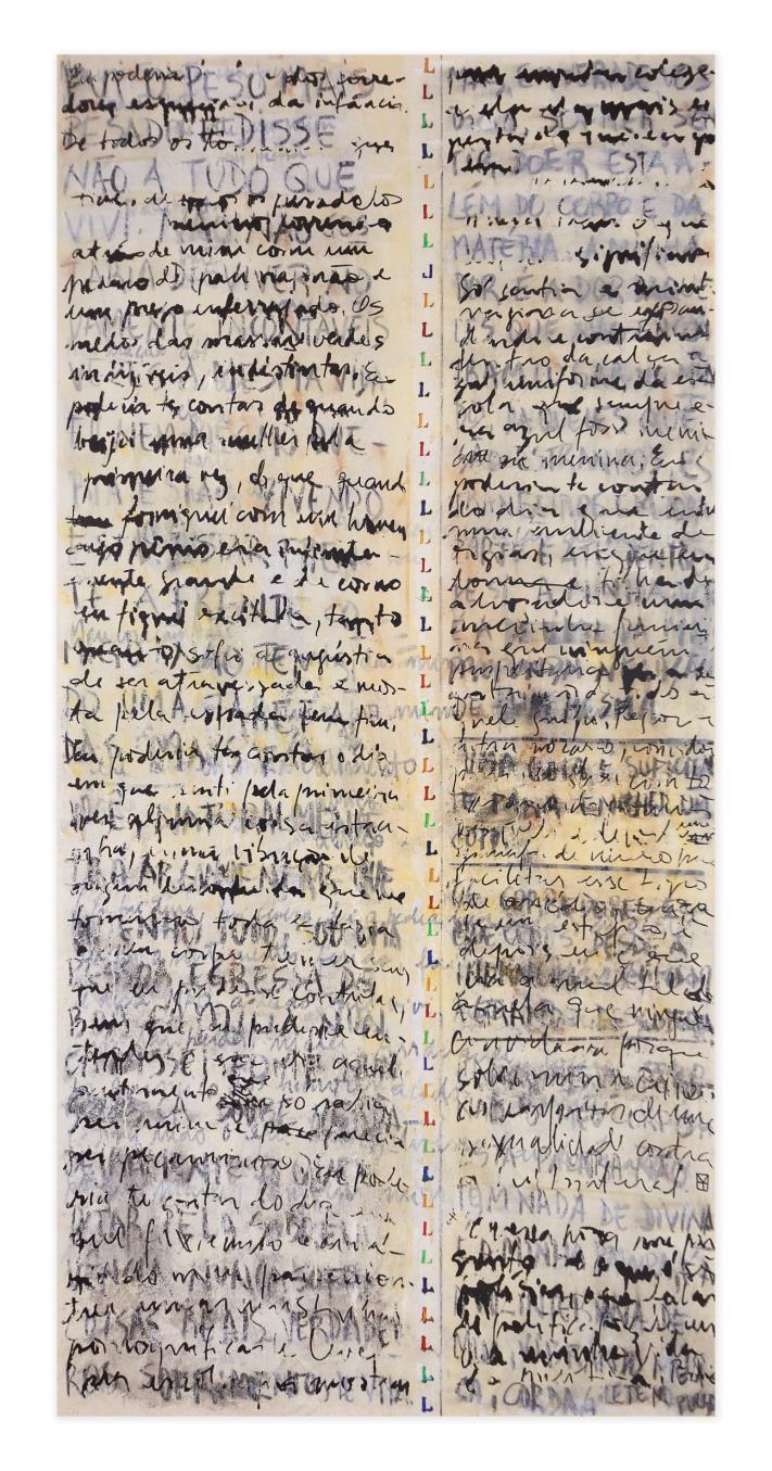 Quando tudo parou , 2022 (O Manuscrito) Carvão, acrílica e caneta acrílica sobre tela 199x97 cm