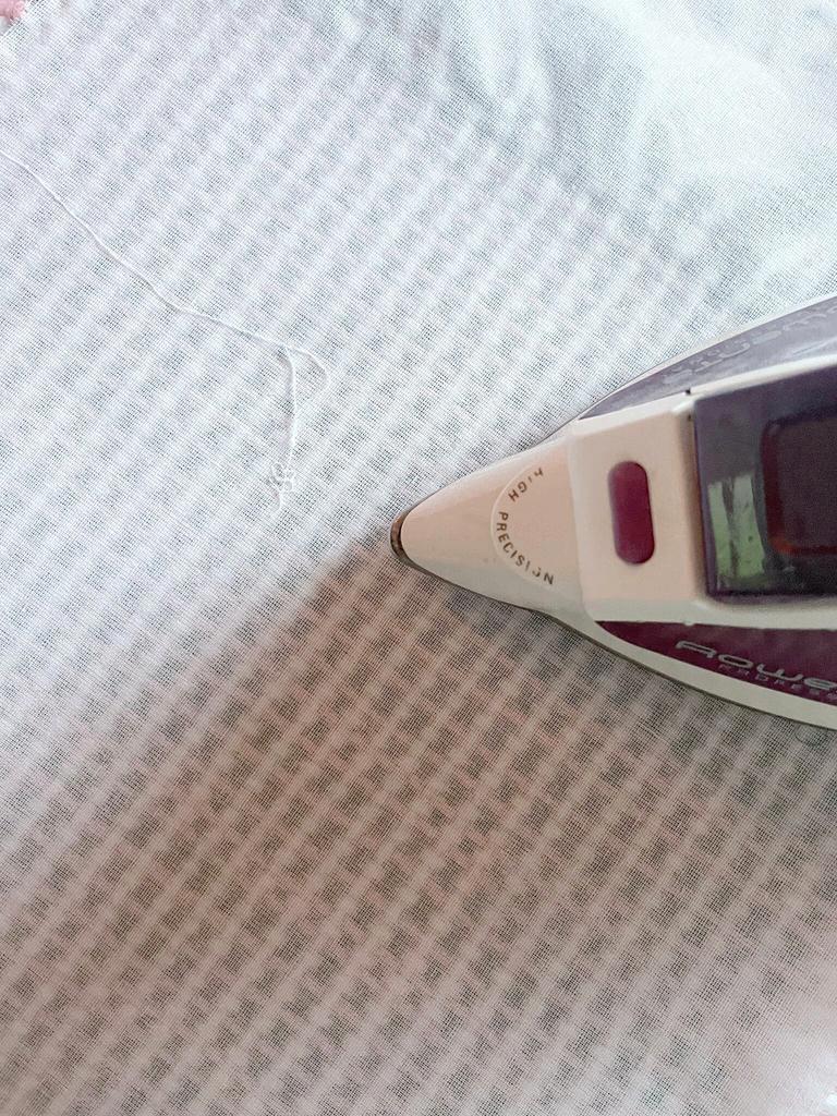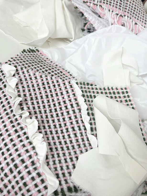 Para realizar las telas, necesité cortar muchos hilos de lana de entre 30 y 40 cm para los tres tamaños de telar que usé. Los entrelacé como tafetán alternando hilos de color (verde o rosa) con blanco. En total hice 10 planchas: 4 para el corpiño, 4 para la falda y 2 para los godets. Luego, se entretelaron con la plancha. Con el bolígrafo de tinta borrable se marcan los patrones para coser con un margen de 0,5 cm y ya cortar las piezas.