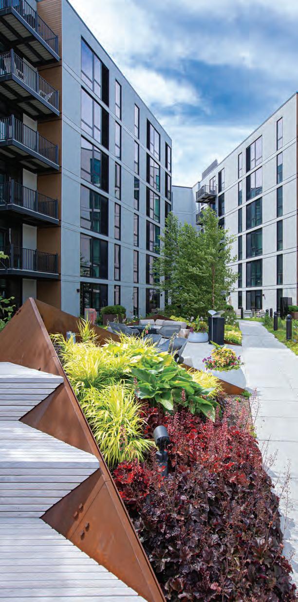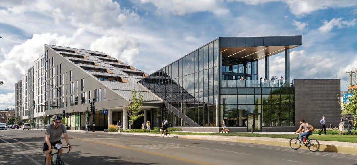 OPPORTUNITY Triangle Square lives up to its name with this uniquely shaped property. LJC took this challenge and delivered a tailored design solution. The building’s massing, including a sloped southfacing roof line with private terraces, provides 75% of the residential units with views of downtown Chicago to enhance the well-being of all occupants.