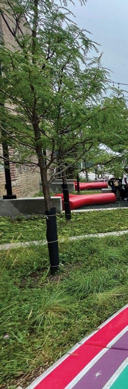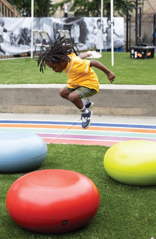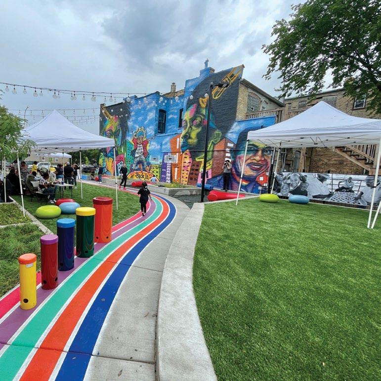 A POP! OF COLOR West Humboldt Park POP! transforms a vacant lot into a vibrant community space with a mural by local artist Barrett Keithley, ample lighting, seating areas, raised planting beds, and grassy sections for play. Designed by LJC for events and everyday use, it enhances the neighborhood as part of Chicago’s Public Outdoor Plaza program.