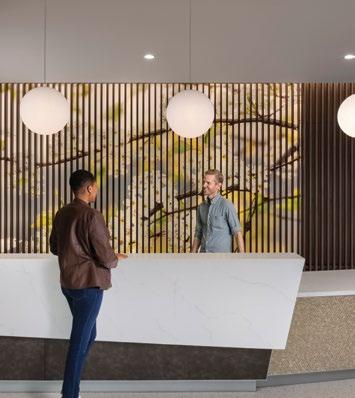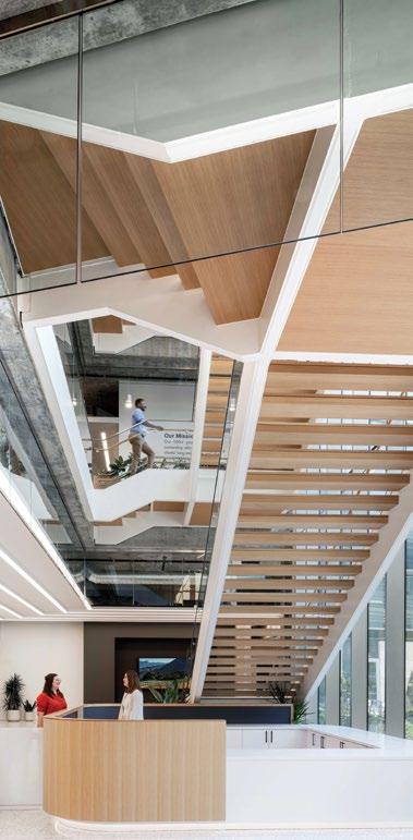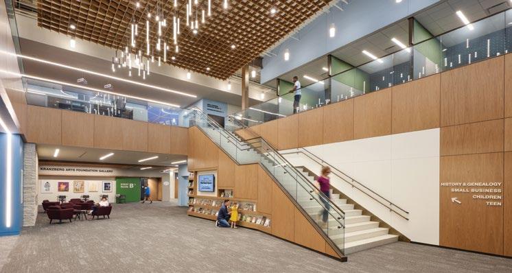 A NEW CHAPTER: THE CLARK FAMILY BRANCH LJC revamped the St. Louis County Library’s headquarters after over 60 years to better serve its growing community. The design team proposed separating functions into two new buildings: one for administration and another for branch library services, reflecting the evolution of libraries into vibrant community hubs. The new library, built by ICS Construction Services, features flexible spaces for various patron activities and its elegant design connects to the district’s other branches, positioning it as the heart of the library community.